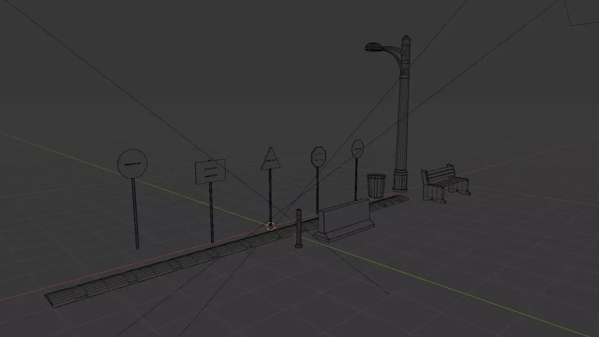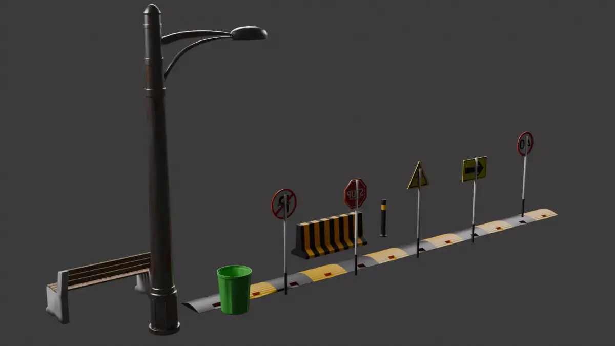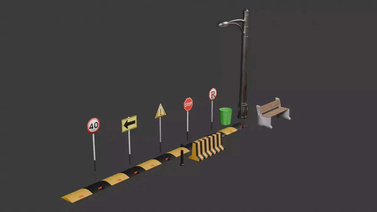 5× Traffic Sign BoardsDustbinStreet BenchStreet LightSpeed BreakerRoad BollardRoad Divider