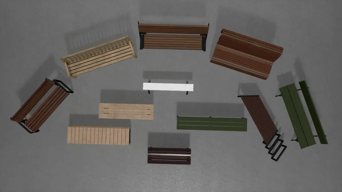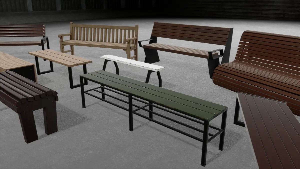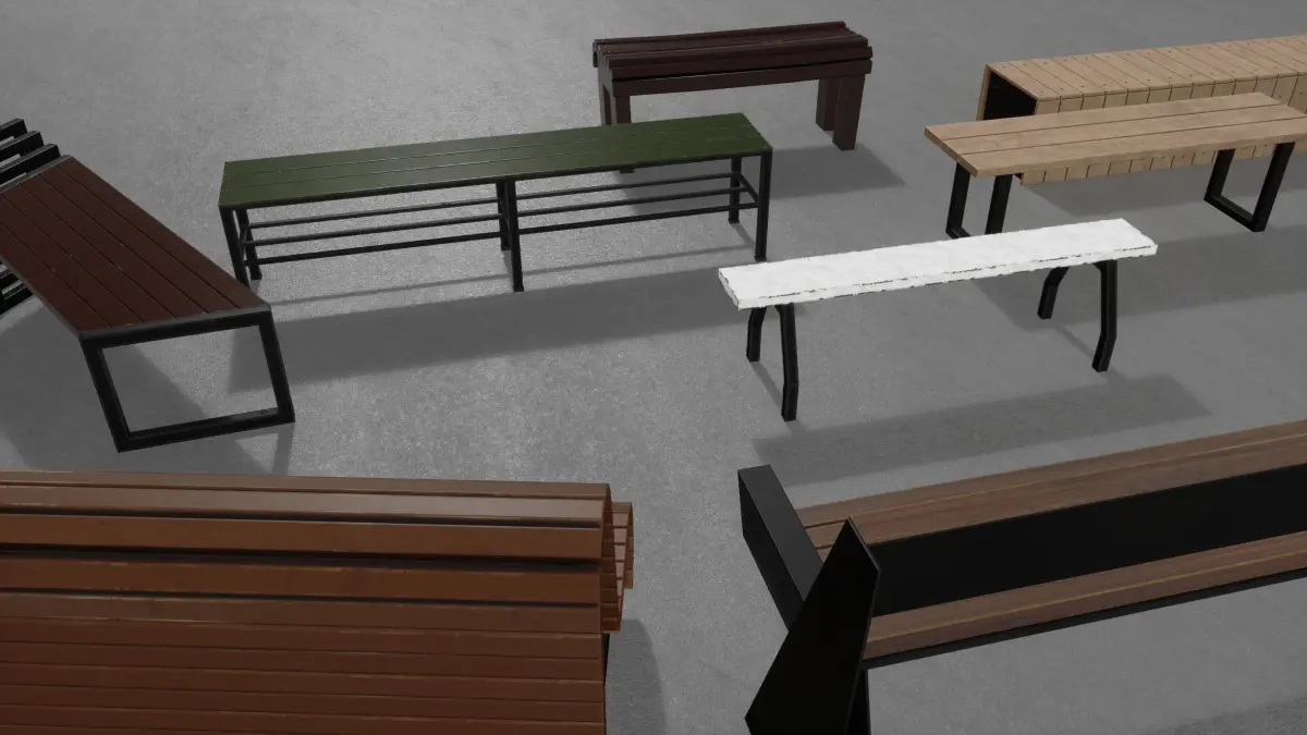 The Bench Wood Set is an asset consisting of various types of benches. No one on the street can be without them.