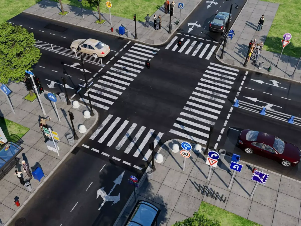 A highly detailed and realistic 3D city street intersection scene, designed specifically for modern urban environments.The scene includes a complete intersection layout, featuring road markings, pedestrian crossings, traffic lights, street signs, bus stops, sidewalks, street furniture, vehicles, and pedestrians, making it ideal for high-quality visualization and real-time applications.All assets are meticulously modeled with clean topology and realistic proportions.Textures are optimized for close-up rendering while maintaining excellent performance in large scenes.Ideal for:Urban Visualization Architectural Visualization Games and Real-Time Engines Film, Animation, and VFX ProductionKey FeaturesComplete city street intersection sceneRealistic road textures and pedestrian crossing markingsTraffic lights, street signs, guardrails, bollards, trash cans, mailboxesBus stop with shelter and signageSupports PBR materialsClean topology and optimized meshScalable modular layoutTechnical Details