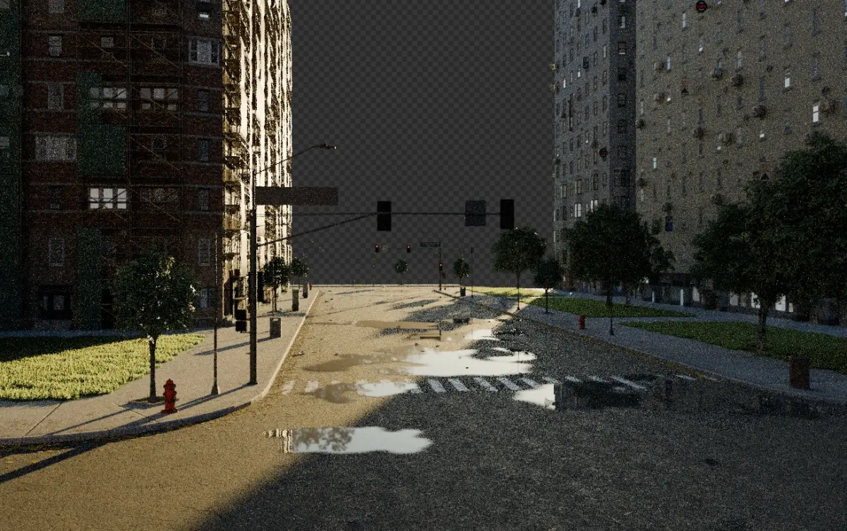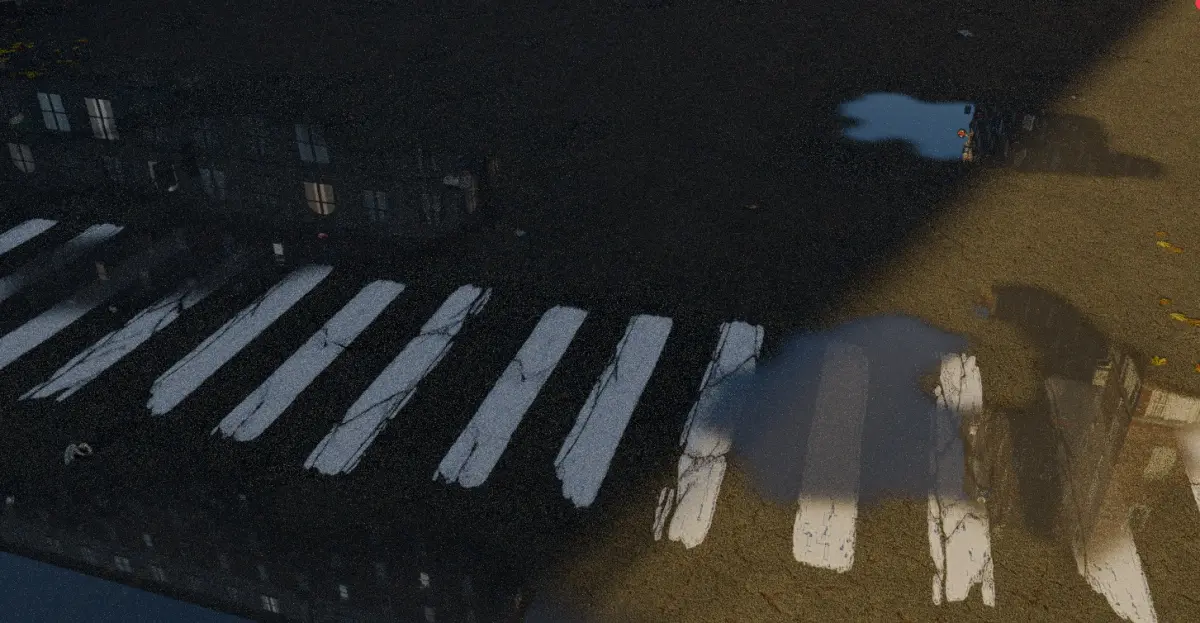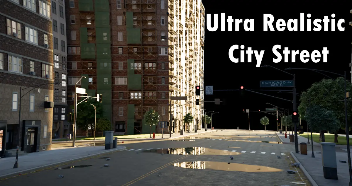 - The model includes a combination of natural and artificial lighting, highlighting the textures and shadows realistically. Puddles on the street reflect the environment accurately, amplifying the immersive quality.