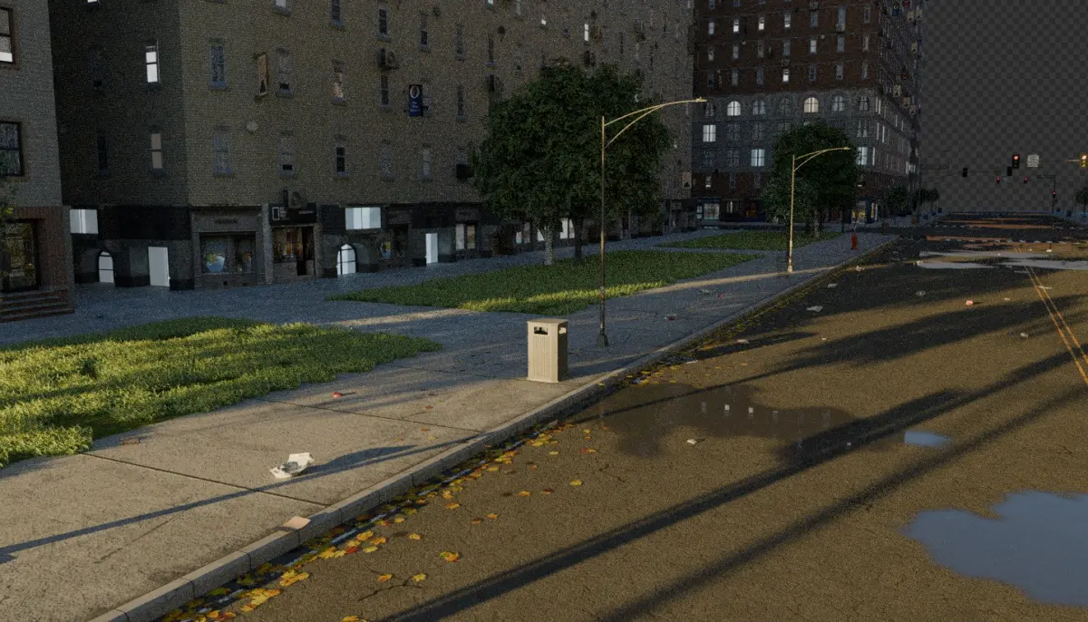 - Sidewalks feature clutter such as garbage and scattered debris, mimicking real-life imperfections.