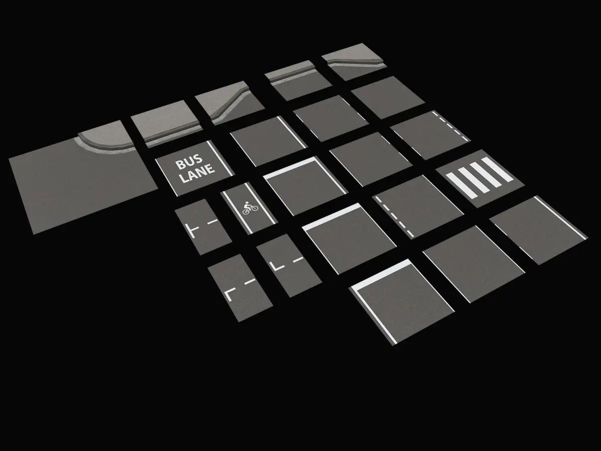 This kit contains pieces of sidewalk and roads with different type of road markings, that will allow you to create a wide variety of streets with endless number of lane. It also includes presets, that will help you build quickly your city streets.