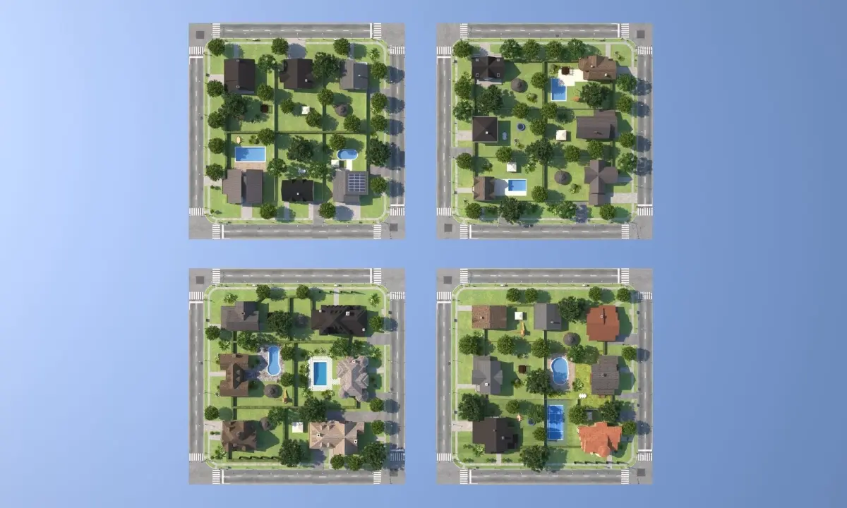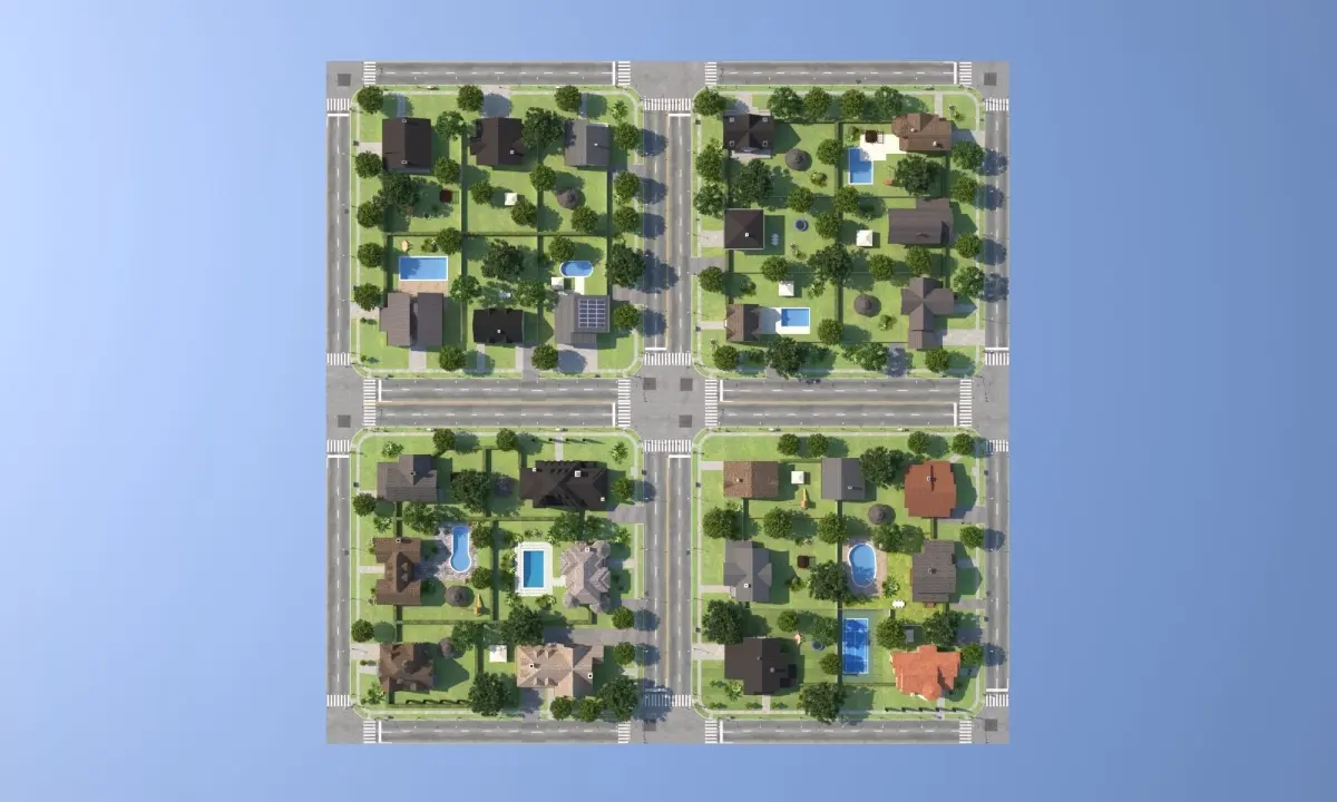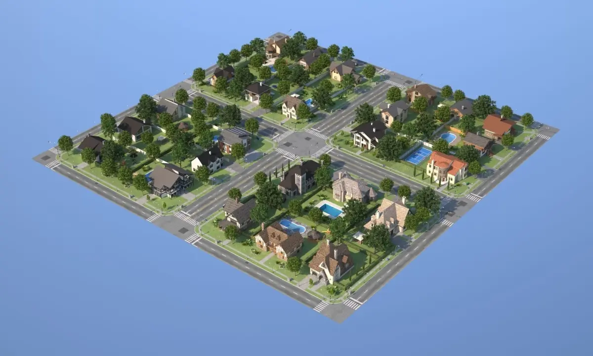 26 detailed housesStreet lights Traffic lights Mail boxes Trees Street Signs Tennis court Superb multi-purpose textures
