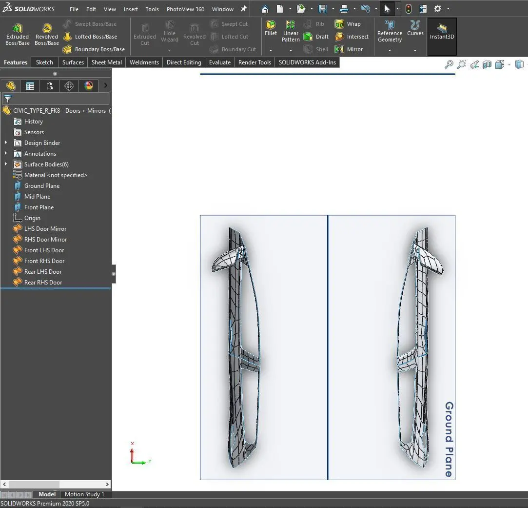 CIVIC TYPE R FK8 Doors + Mirrors Surface model in both SolidWorks 2020 & Parasolid file formats ready for import into most CAD systems. This model is intended to help empower designers/enthusiasts looking for accurate data to design modifications such as mirror caps/side skirts/aero kits/etc. for their cars. This model shares a common coordinate system with the other CIVIC_TYPE_R_FK8 models by DPS Data, allowing assembly of front/rear or full exterior surface assemblies by combining the components together. Expected dimensional variance in the data vs the real-life car is typically between 150-250 microns (0.006”-0.01”) with the methods used to create this model.Included in this download:SolidWorks 2020 [CIVIC_TYPE_R_FK8 - Doors + Mirrors.sldprt] component file.Universal Parasolid [CIVIC_TYPE_R_FK8 - Doors + Mirrors.X_T] component file.