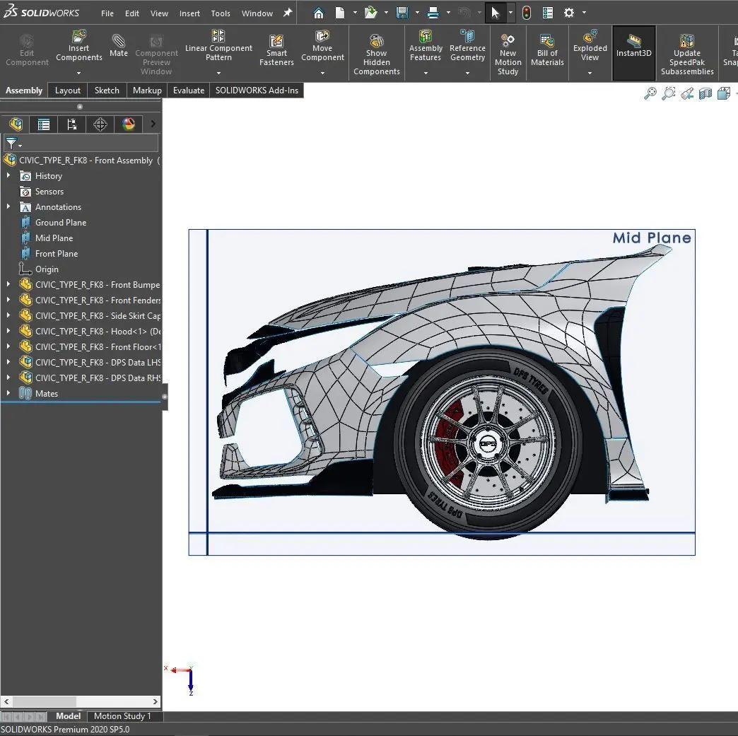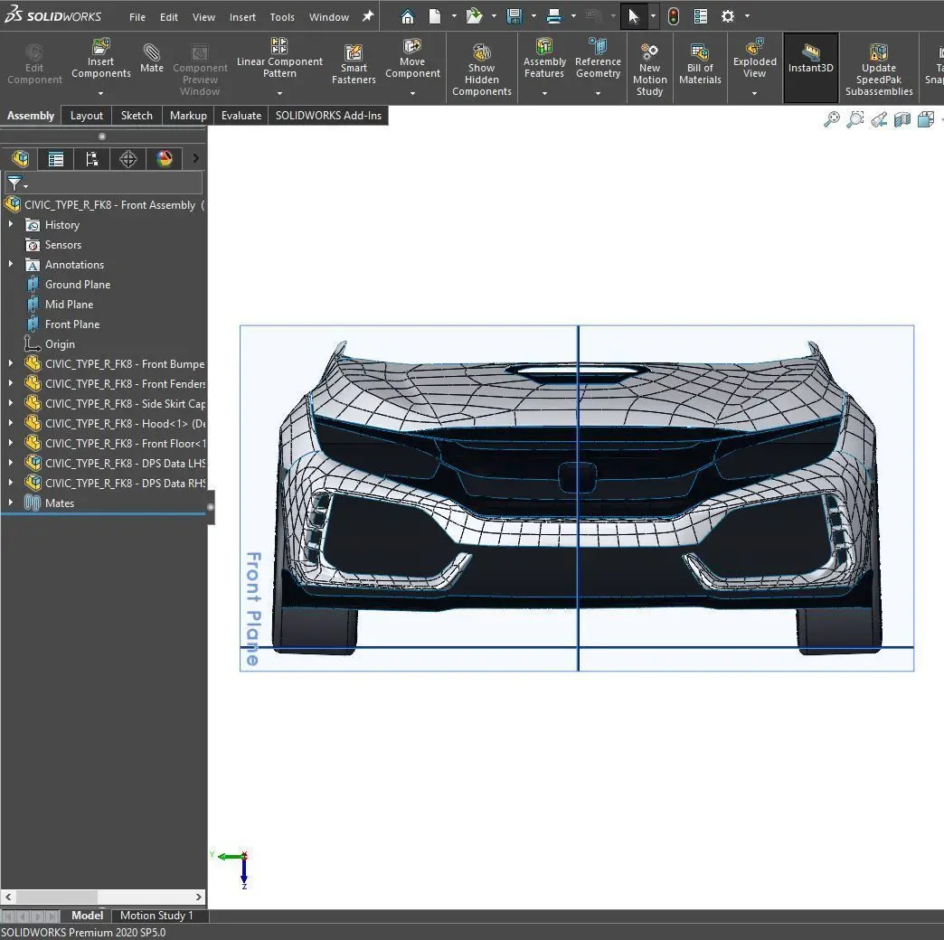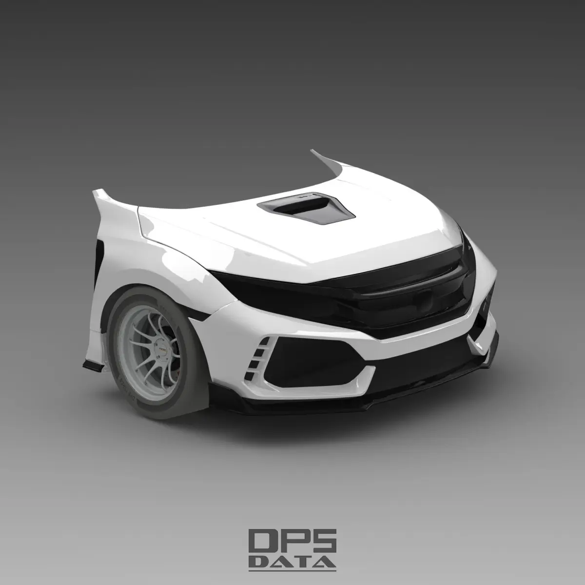 CIVIC TYPE R FK8 Front End Surface assembly model in both SolidWorks 2020 & Parasolid file formats ready for import into most CAD systems. This assembly model is intended to help empower designers/enthusiasts looking for accurate data to design modifications such as front splitters/canards/fender vents/hood vents/overfenders/etc. for their cars. This model shares a common coordinate system with the other CIVIC_TYPE_R_FK8 models by DPS Data, allowing assembly of front/rear or full exterior surface assemblies by combining the components together. Expected dimensional variance in the data vs the real-life car is typically between 150-250 microns (0.006”-0.01”) with the methods used to create this model.Included in this download: SolidWorks 2020 & Universal Parasolid File Formats for each.[CIVIC_TYPE_R_FK8 - Front Assembly] assembly file.[CIVIC_TYPE_R_FK8 - Front Bumper] component file.[CIVIC_TYPE_R_FK8 - Front Fenders] component file.[CIVIC_TYPE_R_FK8 - Hood] component file.[CIVIC_TYPE_R_FK8 - Front Floor + Wheel Mounts] component file.[CIVIC_TYPE_R_FK8 - DPS Data LHS Wheel Assembly] assembly file.[CIVIC_TYPE_R_FK8 - DPS Data RHS Wheel Assembly] assembly file.[DPS Data Wheel Variant 6 - CIVIC_TYPE_R_FK8] component file.[DPS Brake Rotor - FL - CIVIC_TYPE_R_FK8] component file.[DPS Brake Rotor - FR - CIVIC_TYPE_R_FK8] component file.