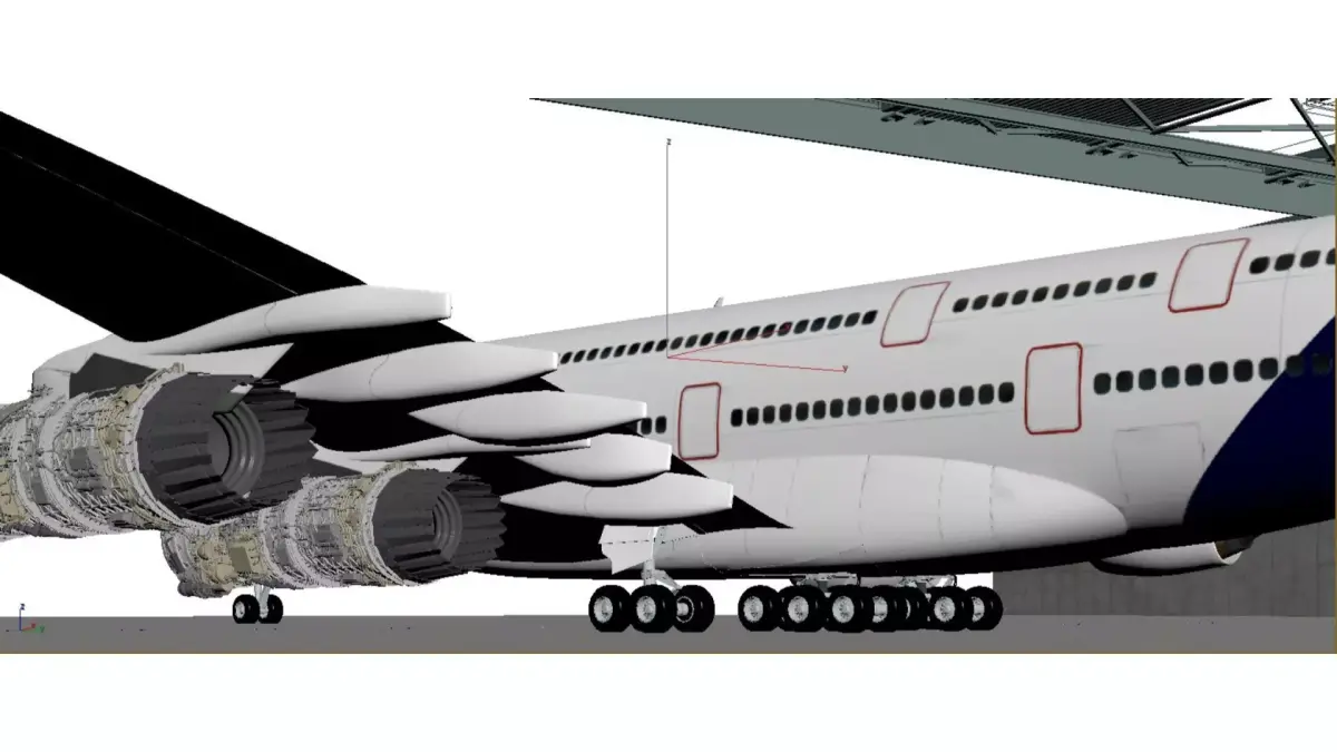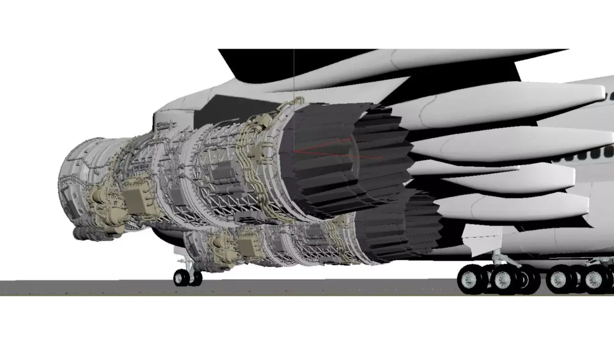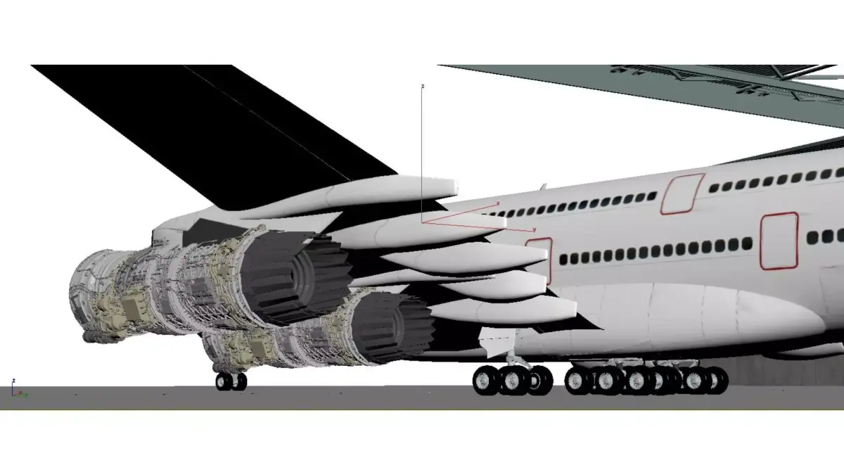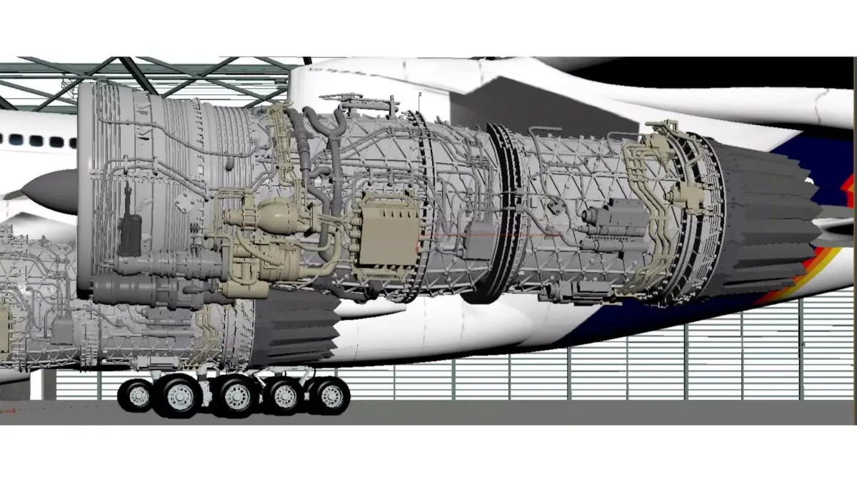 This is a display of the internal structure of a large commercial aircraft and its turbofan engine, set in a modern hangar:Main aircraft:This is a large wide body aircraft with a bright white body, featuring portholes and hatch contours, and an airline logo on the tail wing. Two large bypass ratio turbofan engines are mounted below the wings, and the landing gear is clearly visible. Multiple sets of tires support the fuselage, presenting typical characteristics of large commercial aircraft as a whole.Engine structure:Both engines are displayed in cross-section, clearly showing their internal structure:Fan: The front end is a huge golden/dark gray fan blade, responsible for sucking in a large amount of air, which is a signature feature of a large bypass ratio engine.Compressor, combustion chamber, and turbine: Multiple stages of compressor blades, annular combustion chambers, and high-pressure/low-pressure turbines can be seen inside, nested layer by layer, with a precise and complex structure, reflecting the pinnacle of industrial design for aircraft engines.Material and Details: The engine casing is made of silver gray metal, and the internal components are distinguished by colors such as silver, gold, and black. The details of pipelines, gears, and combustion chambers are clearly depicted, giving it a strong mechanical aesthetic.Environmental atmosphere:The background is a spacious and bright hangar, with steel beam structures and red cranes on the top. The walls are covered with large areas of glass, and the ground is a smooth gray floor. The overall atmosphere is professional and modern, highlighting the precision and power of the aviation industry.This image is commonly used in aviation engineering teaching, engine technology display, or aviation science popularization, visually showcasing the complex structure of modern aviation engines and the majestic atmosphere of civil aviation aircraft.