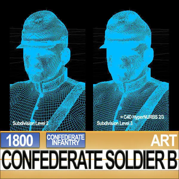Civil War Confederate Soldier B Infantry, Character with 10 Props.Hi-Detailed Subdivision Level 0 [SL0] Model ready for Subdivion Systems-C4D HyperNurbs.6 UV Unwrapped Maps. 104 Alternate textures. With Confederate Pattern 1853 Enfield Rifle.More than 8 different Uniforms: Original Regulation 1861, Common Regulation, North Virginia, White, Brown, etc.All purpose easy editable SL0 model!Use it as Master Model to create a crowd of different similar characters!