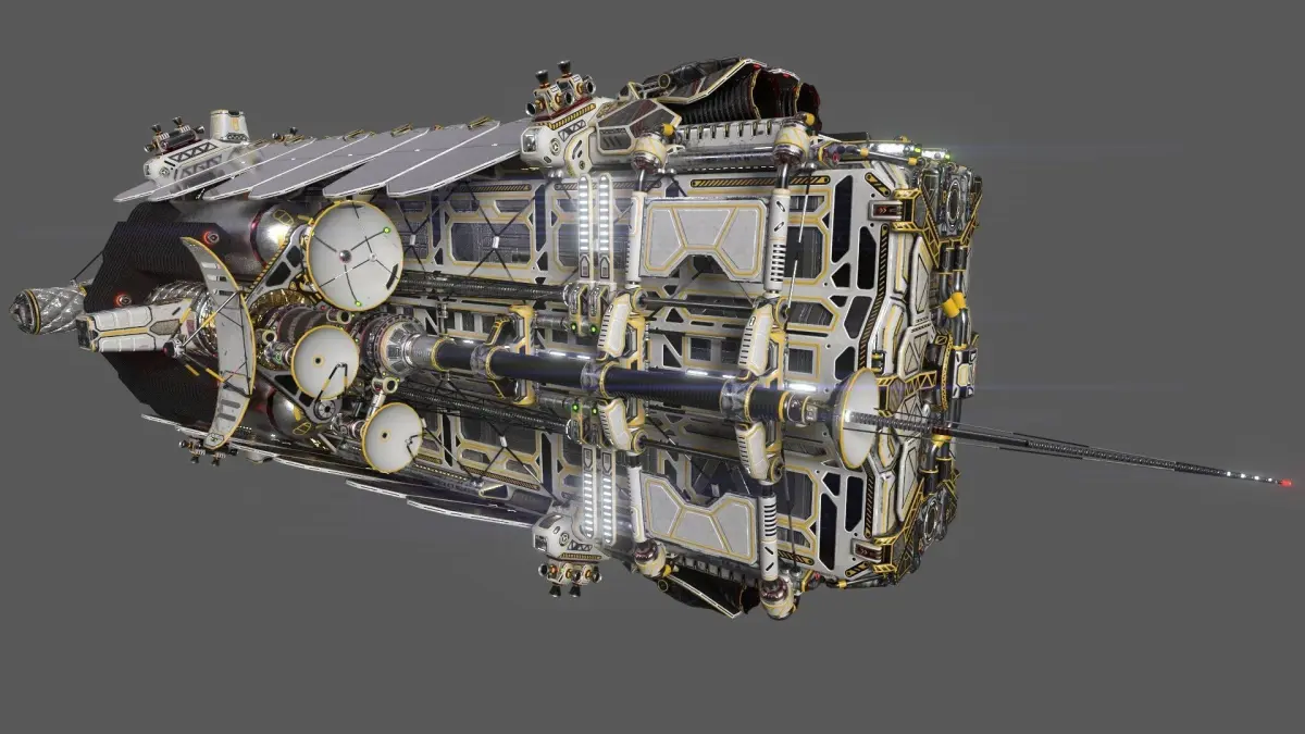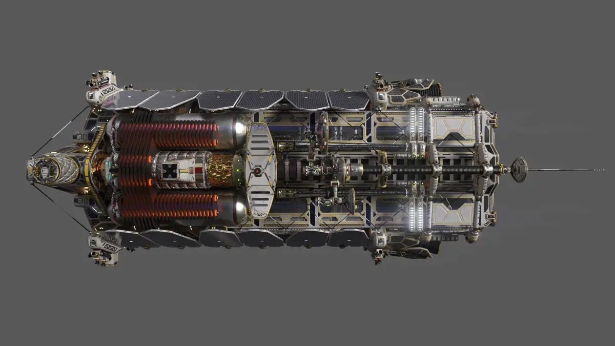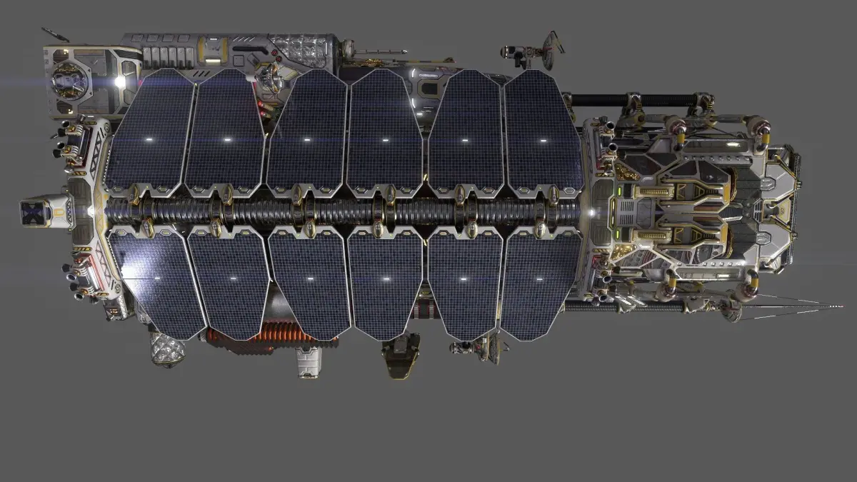 After the War of Greed, which swept through the entire solar system like a fiery hurricane and brought down the entire space economy of mankind, there was an urgent need to quickly produce a huge number of cheap and easy-to-operate transport ships, relying only on the surviving production facilities of the Empire and the expertise of the few remaining loyal Corporations. The result of this collaboration was a project with a not very romantic, but quite appropriate name Dromedary. Severe post-war restrictions led to a technical downgrade not only of this, but of many subsequent engineering projects, especially in the field of propulsion systems. In particular, it was decided to abandon the already standard fusion propulsion system, returning to the now obsolete fission system, making all kinds of improvements and modifications to it in the process.The head of this ship is a spacious frame, which by default holds a huge universal container for transporting almost any cargo.On both sides of the frame, advanced solar panels are placed in parallel for additional power supply and an alternative energy source in case of a reactor accident. Another side of the frame is reserved for a powerful communications hub, capable of not only guaranteeing long-range communications, but also powerful enough to bypass potential interference caused by debris fields, radioactive dust and other consequences of space war.Also behind the communication node was placed a small nuclear reactor, fuel tanks and a radiator, ensuring the functioning of four small bow nuclear engines.The remaining side houses the ship's command module, as well as a secondary communications system.An interesting feature of this section is that the command center is placed on a rotating base and is able to rotate along one axis. While this was clearly not a necessary detail, many believe that this change was made purely for aesthetic purposes by the corporate engineers, so that when this section was included in the corporate designs, the vertical profile of their ships could be retained. Almost the last symbol of defiance in the face of the victorious Empire.Be that as it may, as a result of this forced collaboration of the once warring parties, one of the most successful designs of a civilian cargo ship was created.