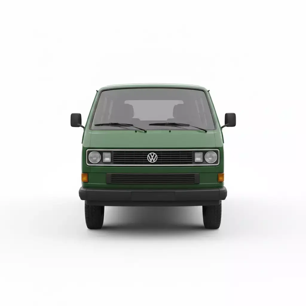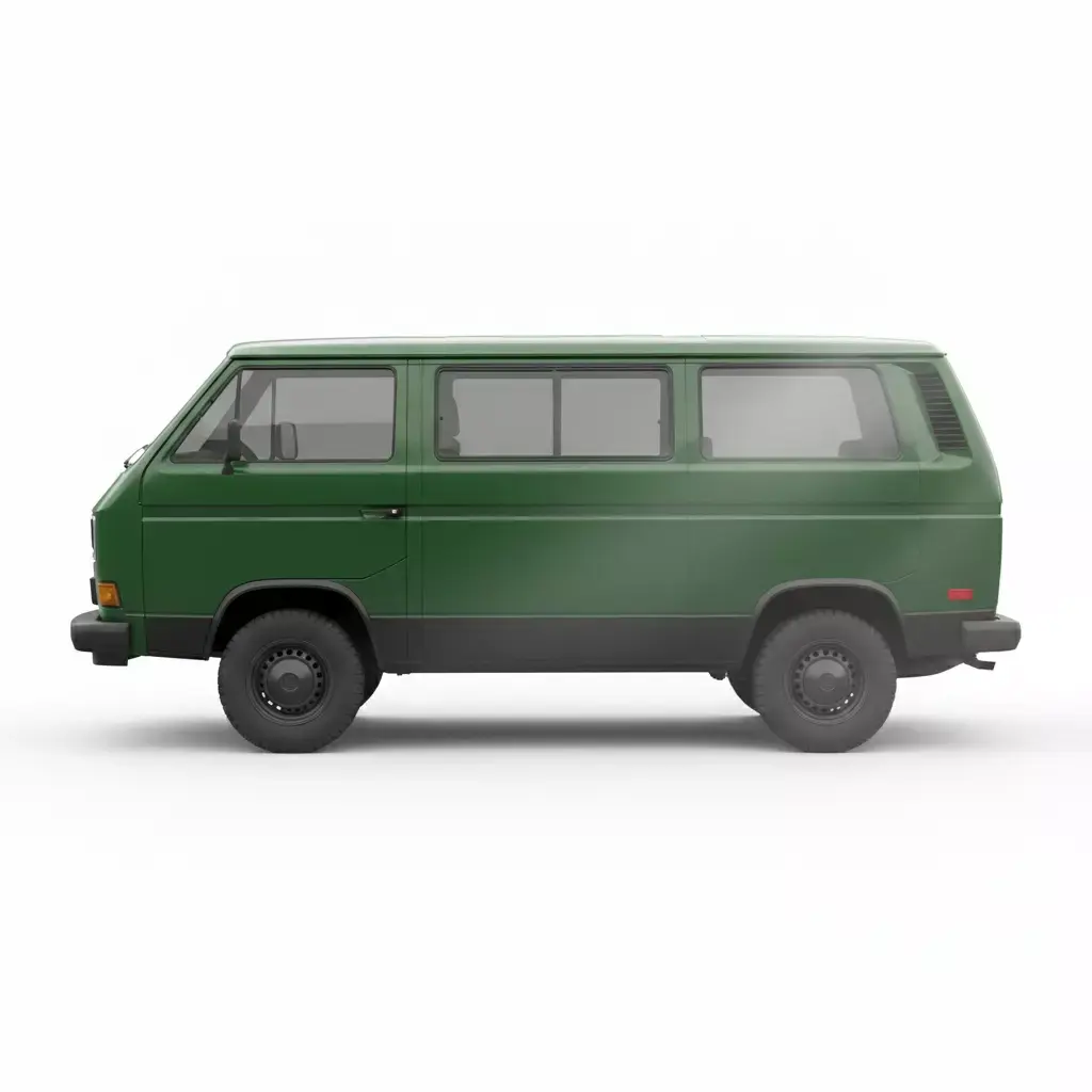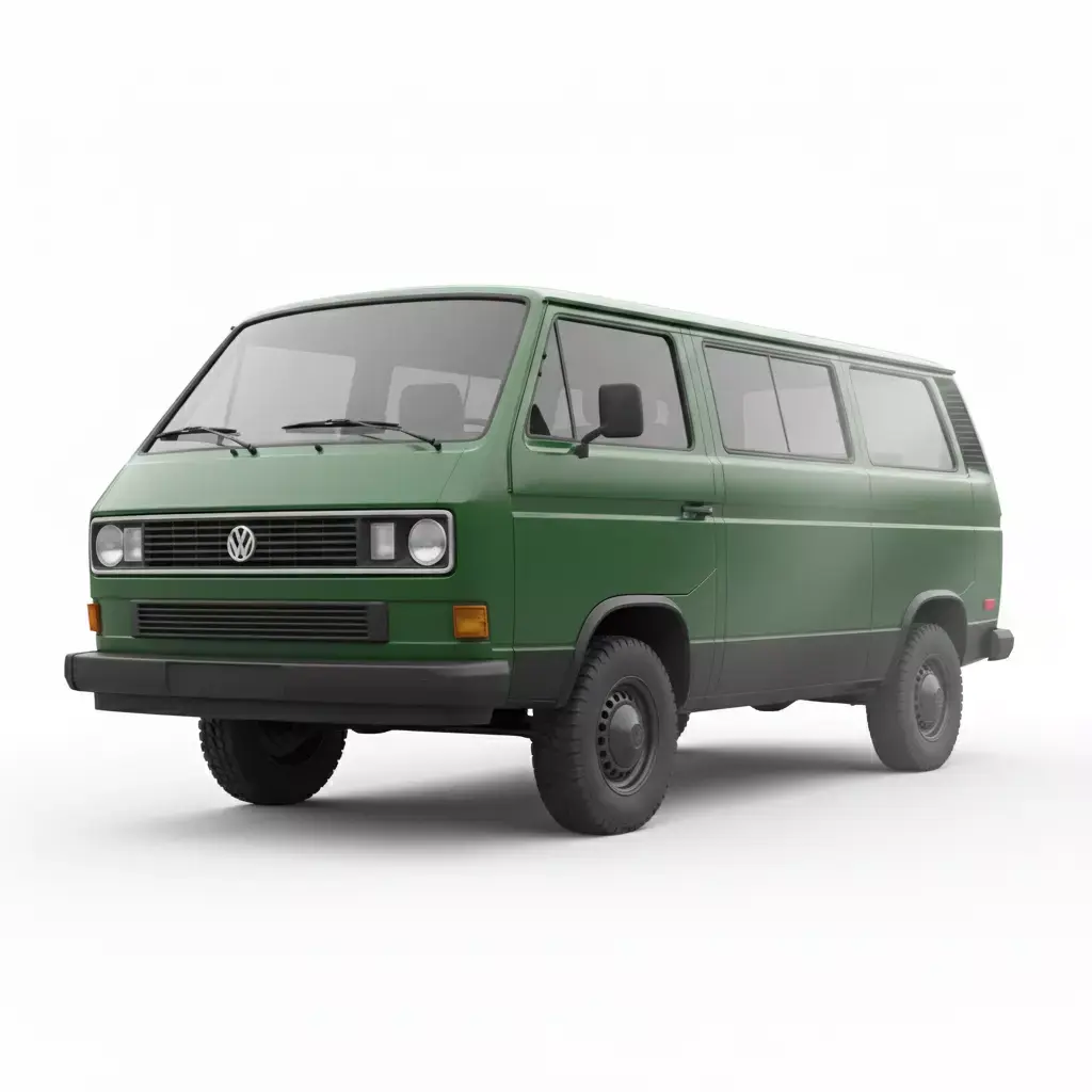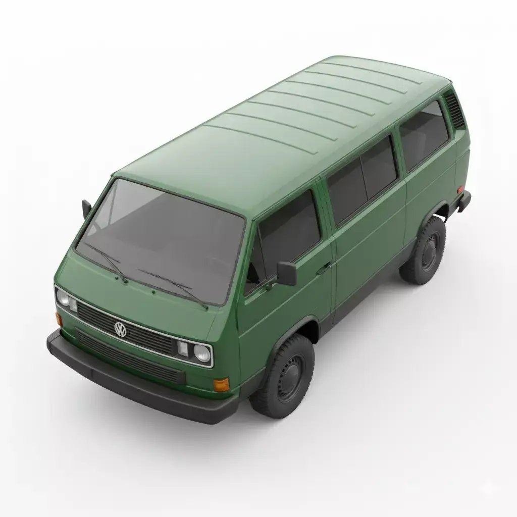 This is a highly accurate 3D model of a classic 1980s utility van, specifically designed after the Volkswagen T3 (Vanagon/Transporter). The vehicle is finished in a muted forest green with a contrasting matte black lower bumper and trim. Notable features include its iconic boxy silhouette, a detailed front grille with the circular VW emblem, and round headlamps. The model is equipped with rugged off-road tires, suggesting a versatile build capable of both city driving and light adventure. This clean and well-proportioned asset is ideal for projects requiring a reliable, vintage-style vehicle for urban or rural 3D environments.