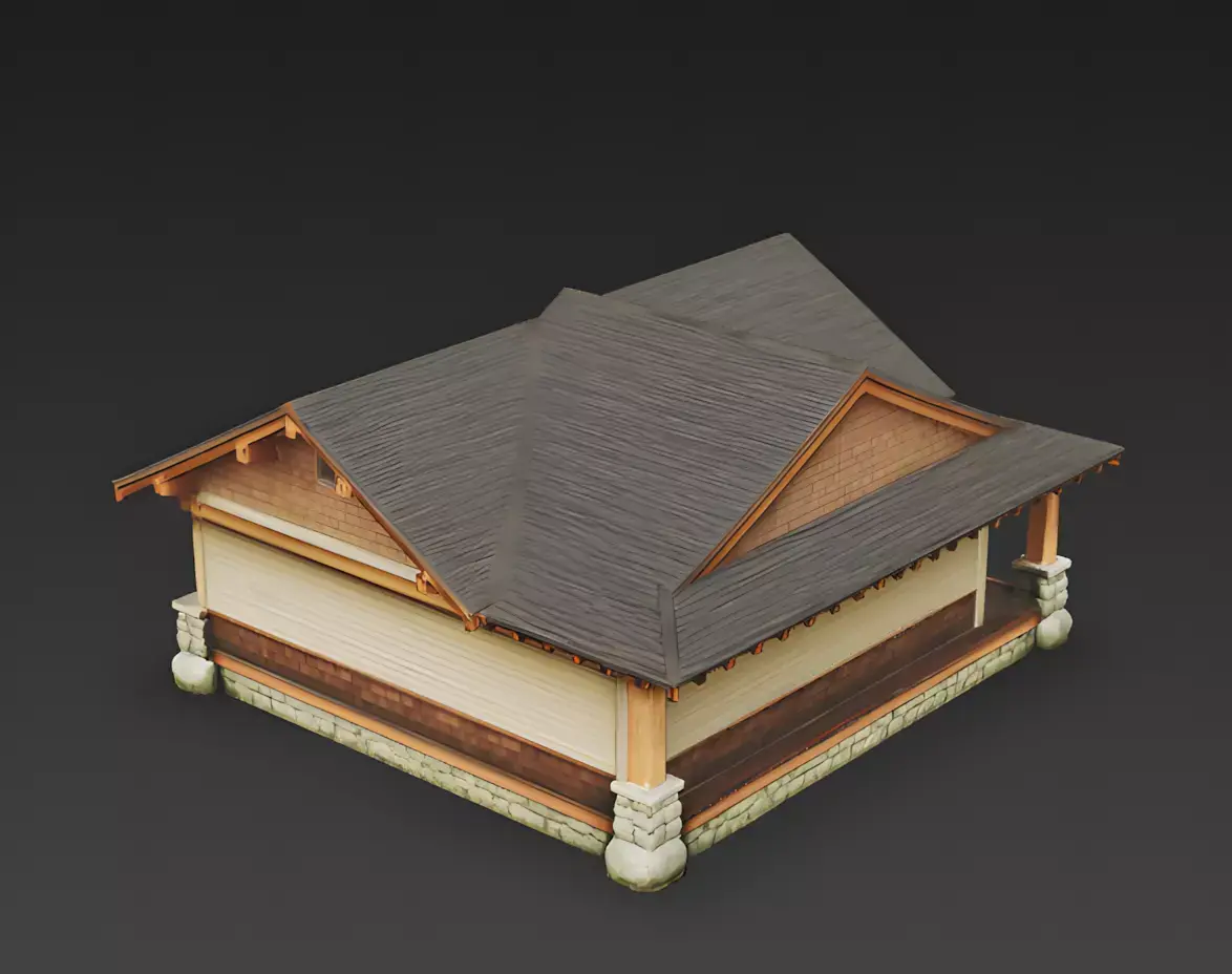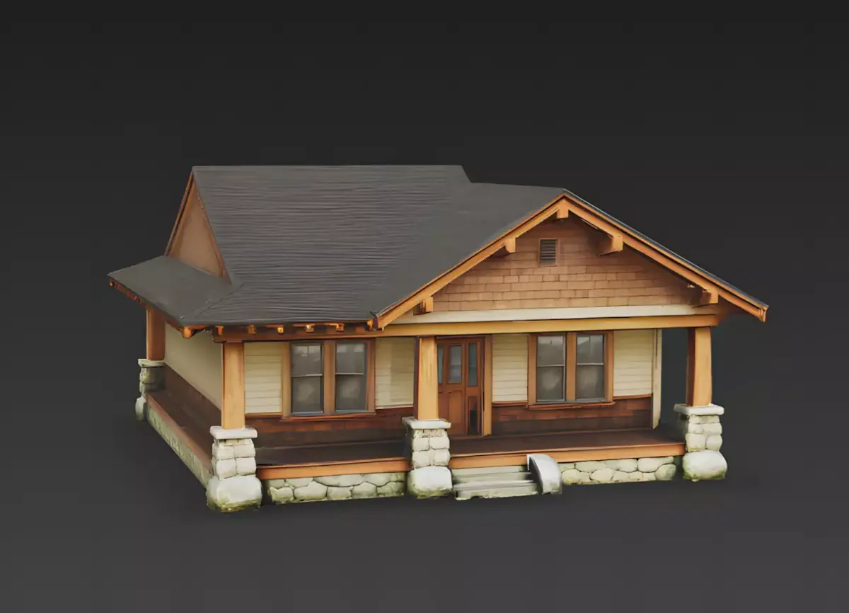 The Overall Concept This asset is a cozy, single-story house designed in the Craftsman Bungalow style. It represents the quintessential American suburban home from the 1920s or 30s, known for its handcrafted look and connection to nature.