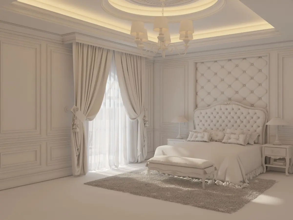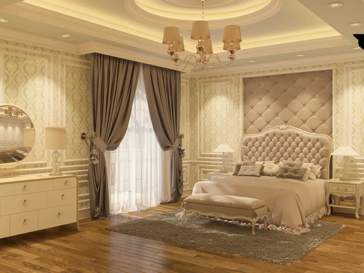 A classic 3d modeling bedroom design created with 3ds max, rendered using vray, and edited in photoshop