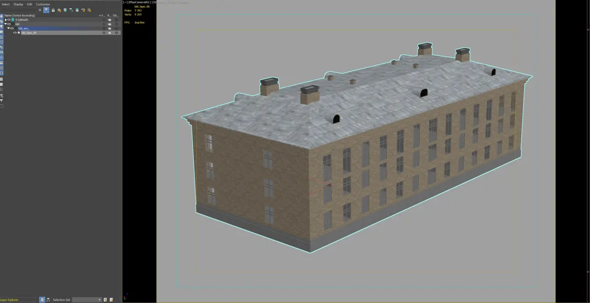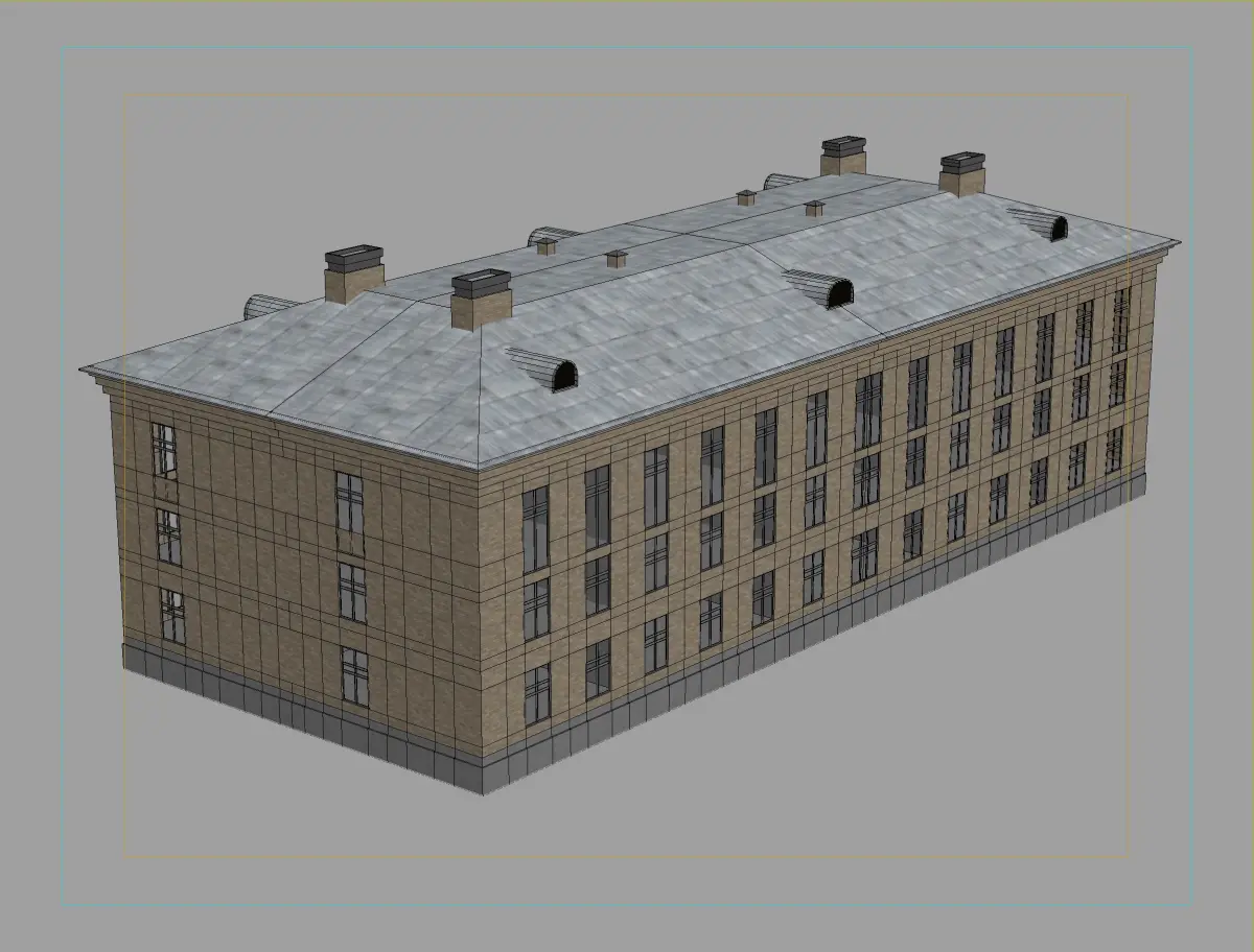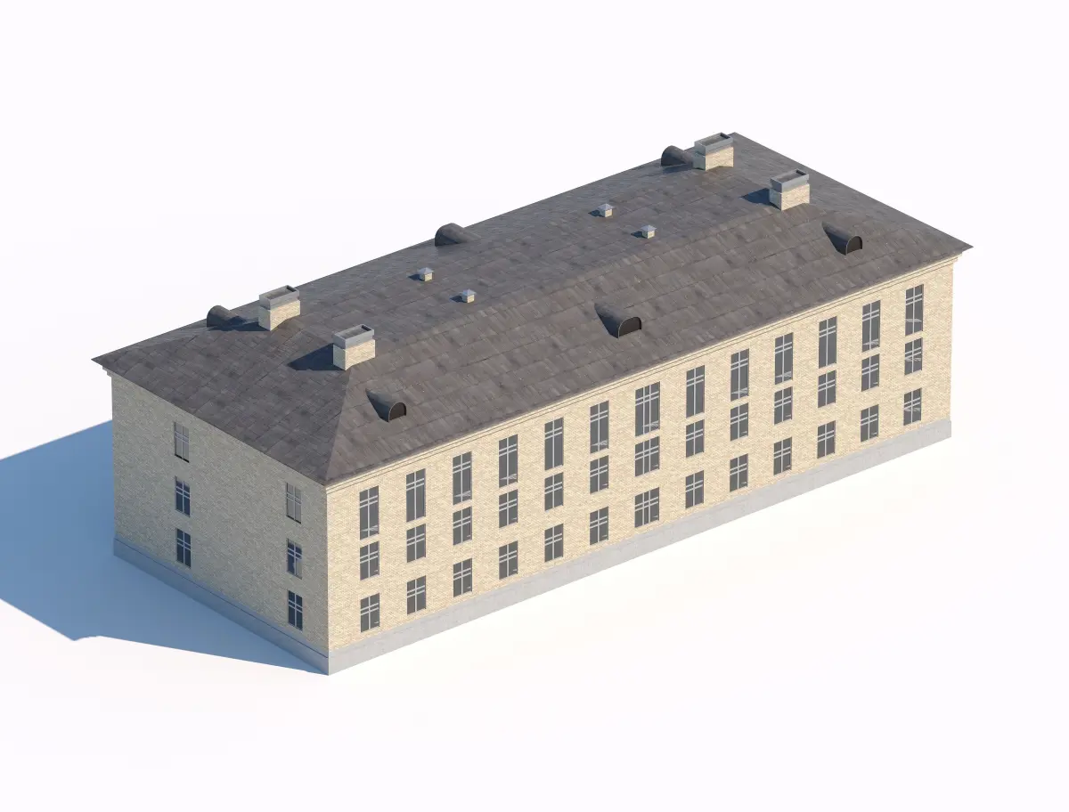 A three-story brick residential building with large windows and a pitched roof, suitable for urban or historical settings.