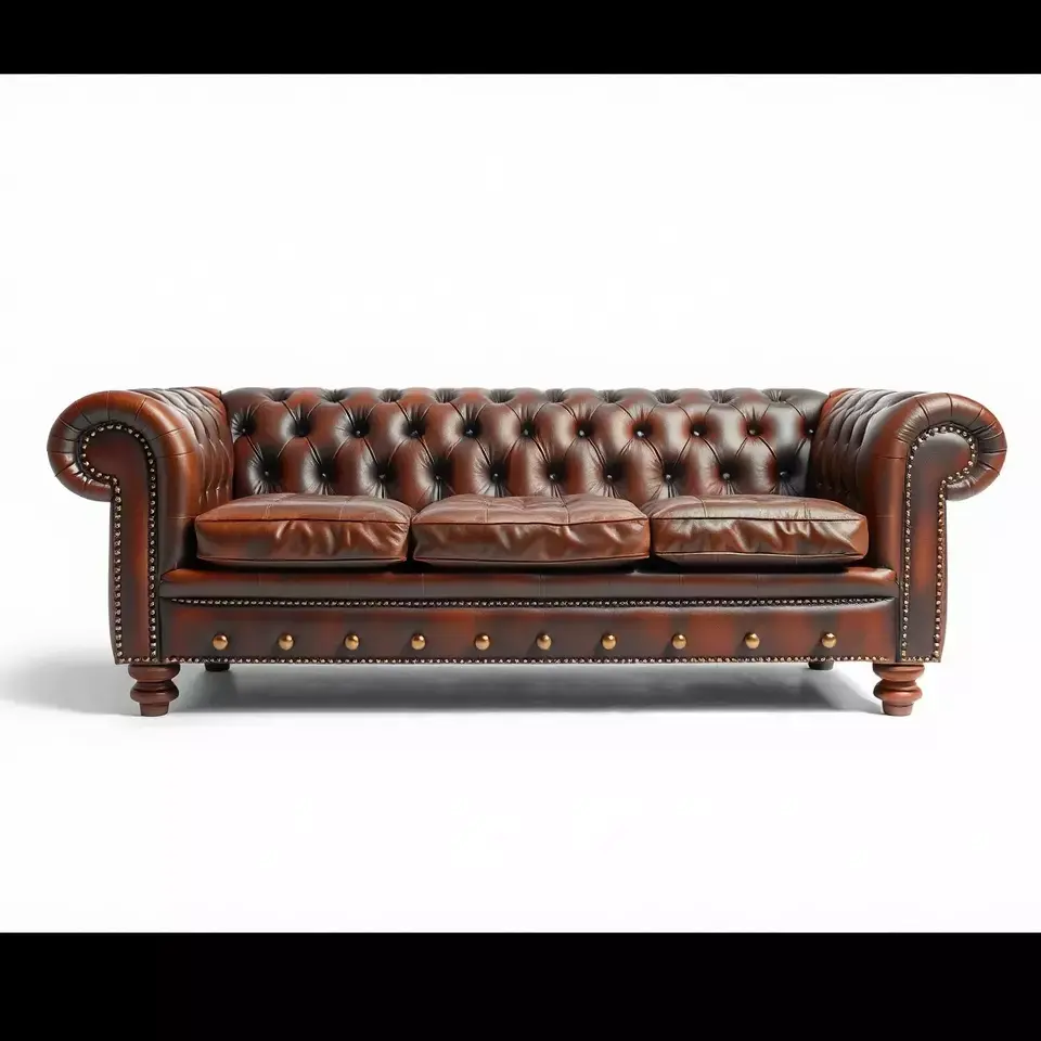 This 3D model features a classic Chesterfield sofa design, showcasing a rich brown leather texture with deep button tufting and rolled arms. It perfectly suits both modern and traditional interiors, ideal for virtual reality setups and architectural visualizations.