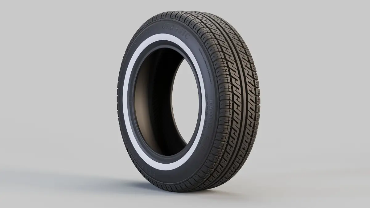 Digital 3D model of classic white wall car tyre. The model has tyre inside as a separate part, so it can be hidden/deleted when the tyre is mounted on a wheel.