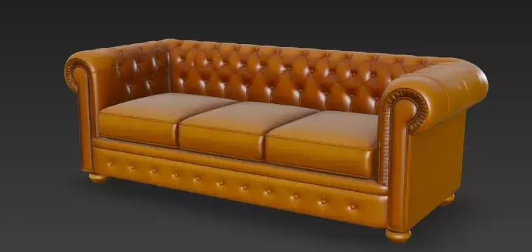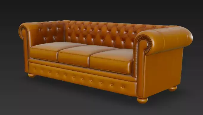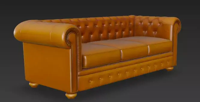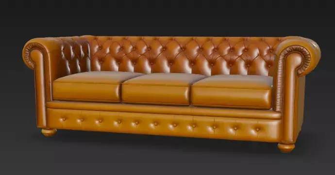 This 3D model showcases a luxurious Chesterfield sofa, featuring a rich tan leather finish, tufted backrest, and rolled arms for a timeless, elegant look. Perfect for interior design projects, virtual staging, or furniture showcases, the model highlights detailed craftsmanship with smooth textures and sturdy wooden legs.