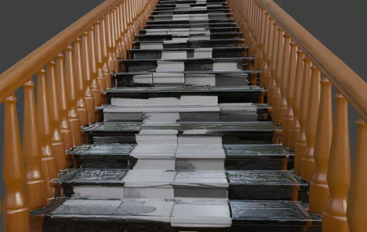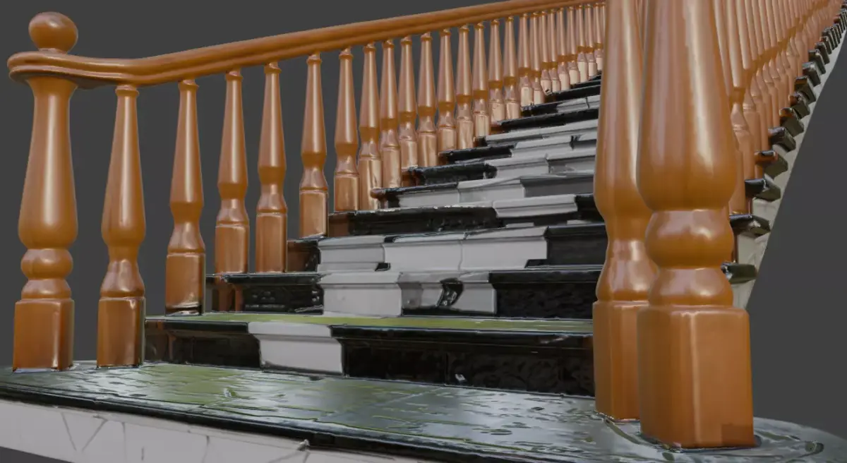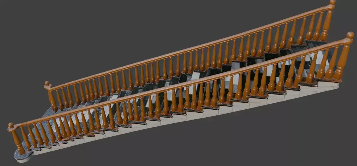 A beautifully detailed 3D model of a traditional straight staircase featuring luxurious dark marble treads with white nosing and rich polished wood handrails supported by intricately turned balusters and decorative newel posts. Perfect for period homes, high-end residential interiors, historical reconstructions, luxury visualizations, and sophisticated architectural renders.