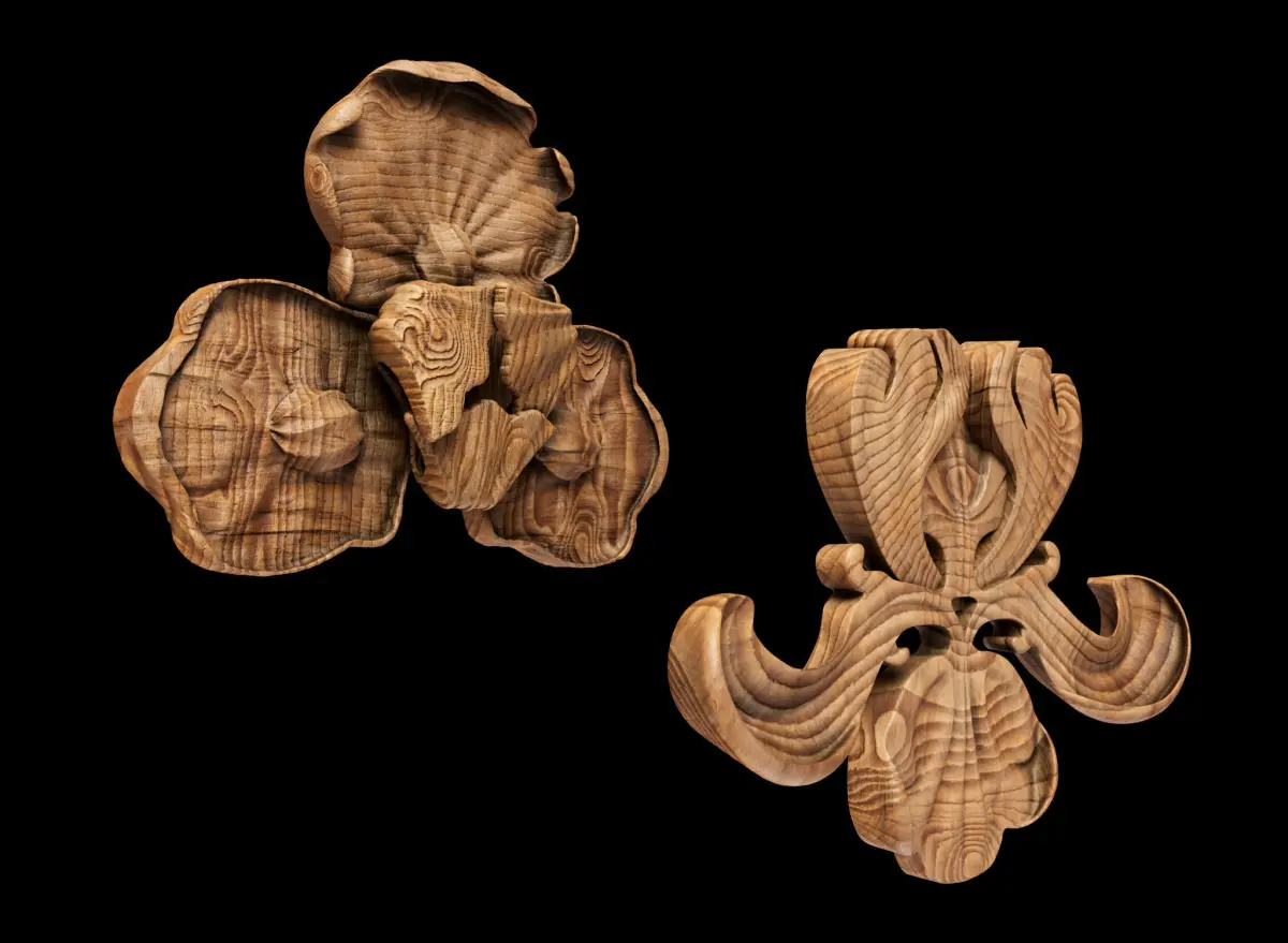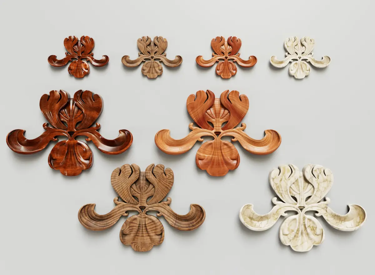 Detailed realistic 3D model ready for visualization.Two models of flowers for architectural and other types of decor in various textures of wood and marble. Two sizes are provided: small - the first flower is 10x7cm, the second flower is 10x8 cm; big - the first flower is 20x14 cm, the second flower is 18x14cm. Each flower is assembled from combined elements. High-poly models and low-poly models for smoothing are available.Material_Base_Color;Material_Height;Material_Height;Material_Mixed_AO;Material_Normal_DirectX;Material_Roughness .