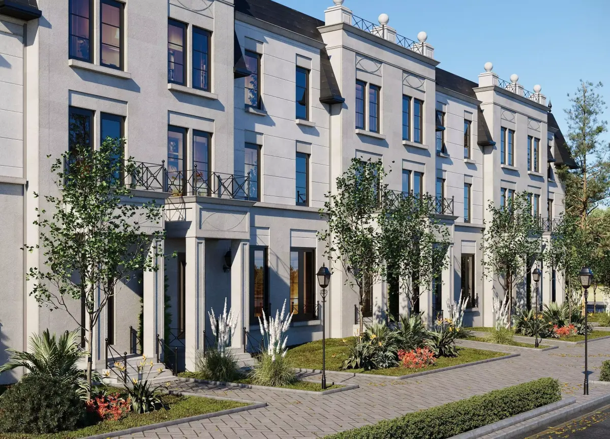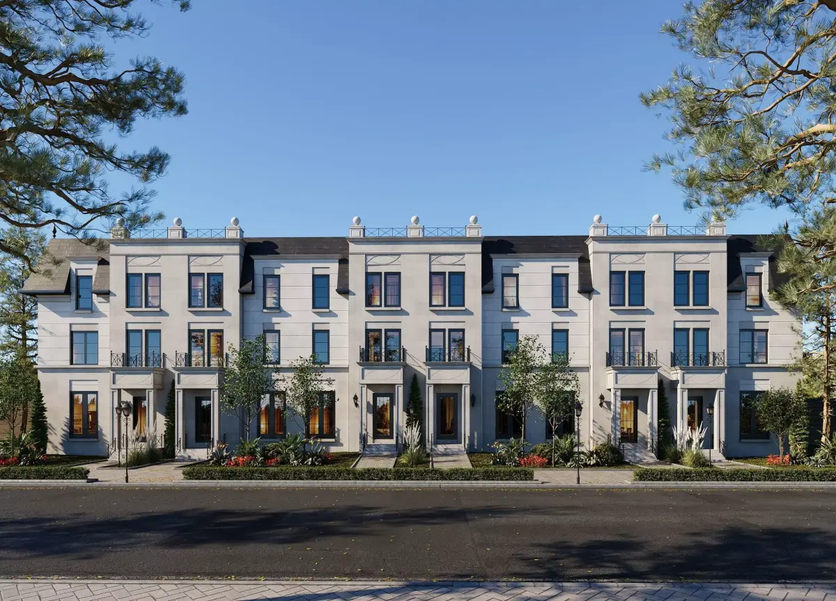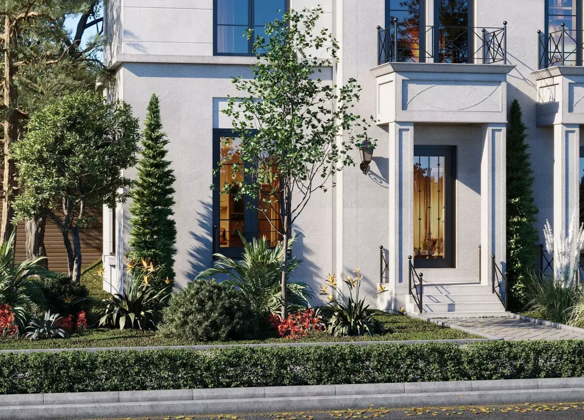 A refined neoclassical townhouse facade featuring balanced proportions, elegant detailing, and high-quality materials. Designed with a harmonious blend of classic architectural elements and modern residential functionality, ideal for upscale urban developments.