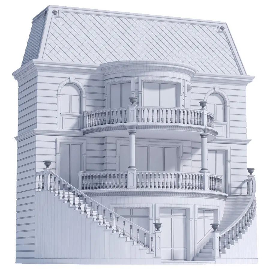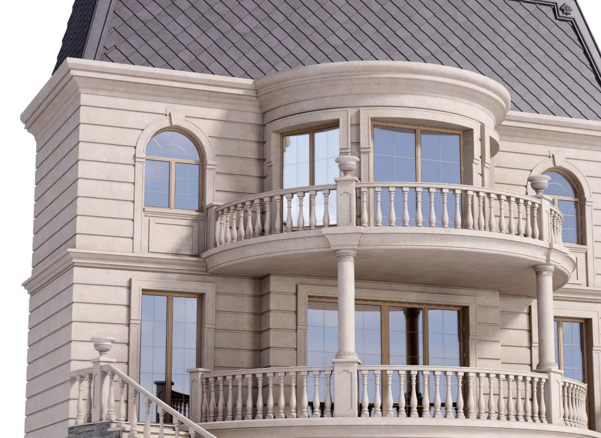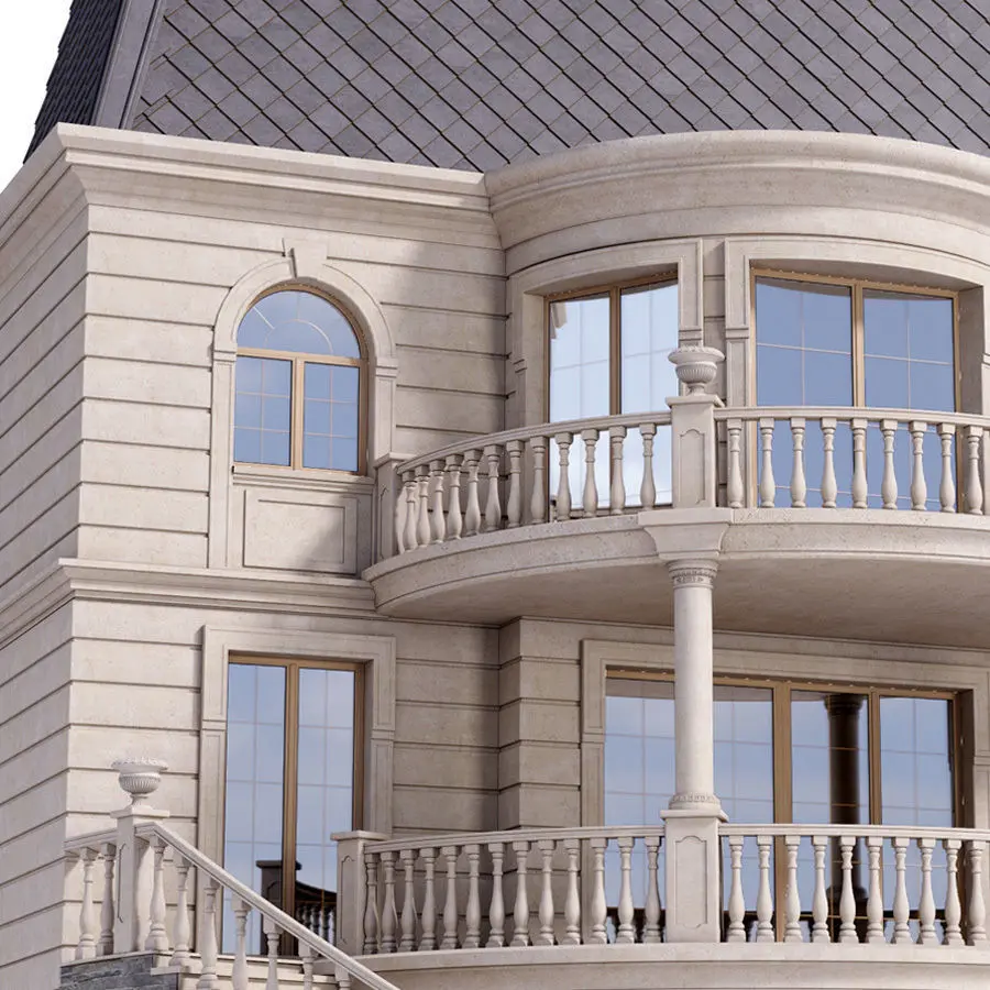 Fragment of the facade of a private estate with slate plinth, rusticated walls, arched windows, gray tiles, balconies, window covers made of stone, radial staircases, flowerpot vases and balusters, windows with accessories (false overlay) in the classical styleCorona and Vray materials are in the same scene in the material editor. Vray+Corona