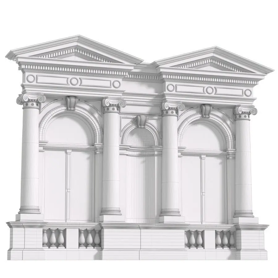 Fragment of a classic facade with arched windows (arcade), round columns, decorative arched niche, triangular pediment and balustrade.