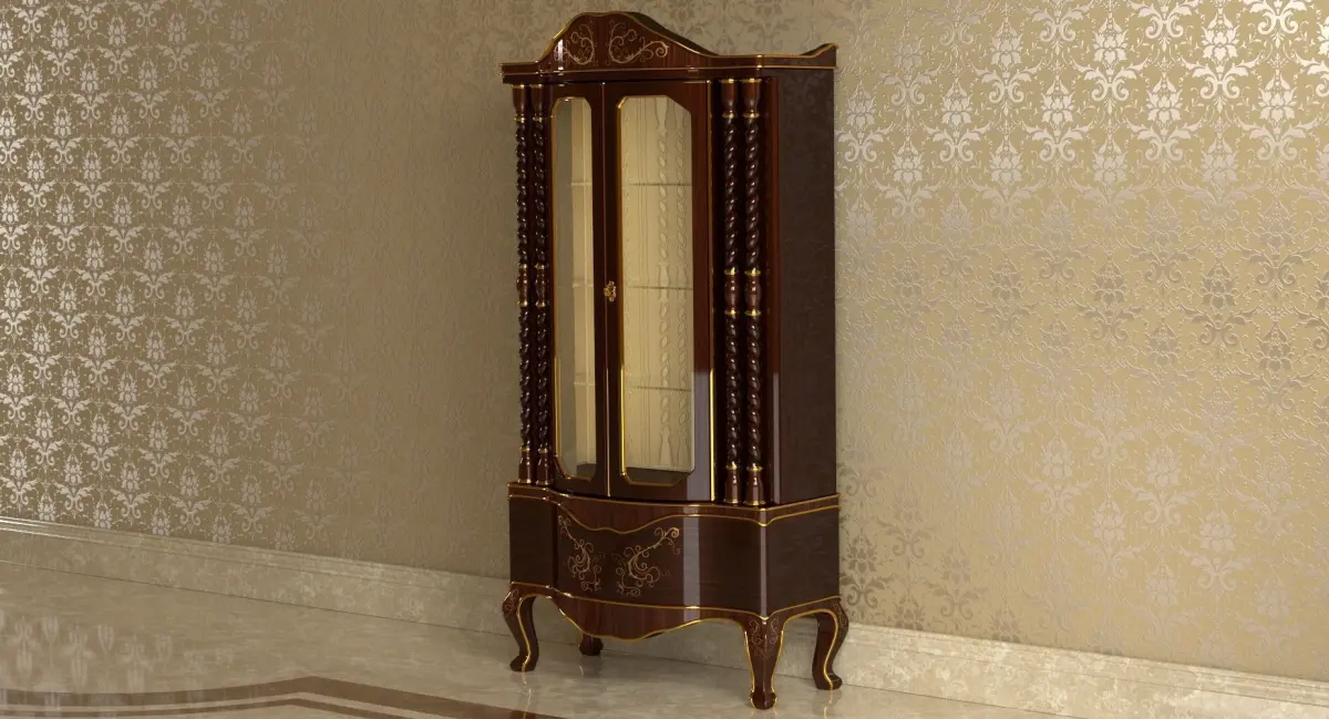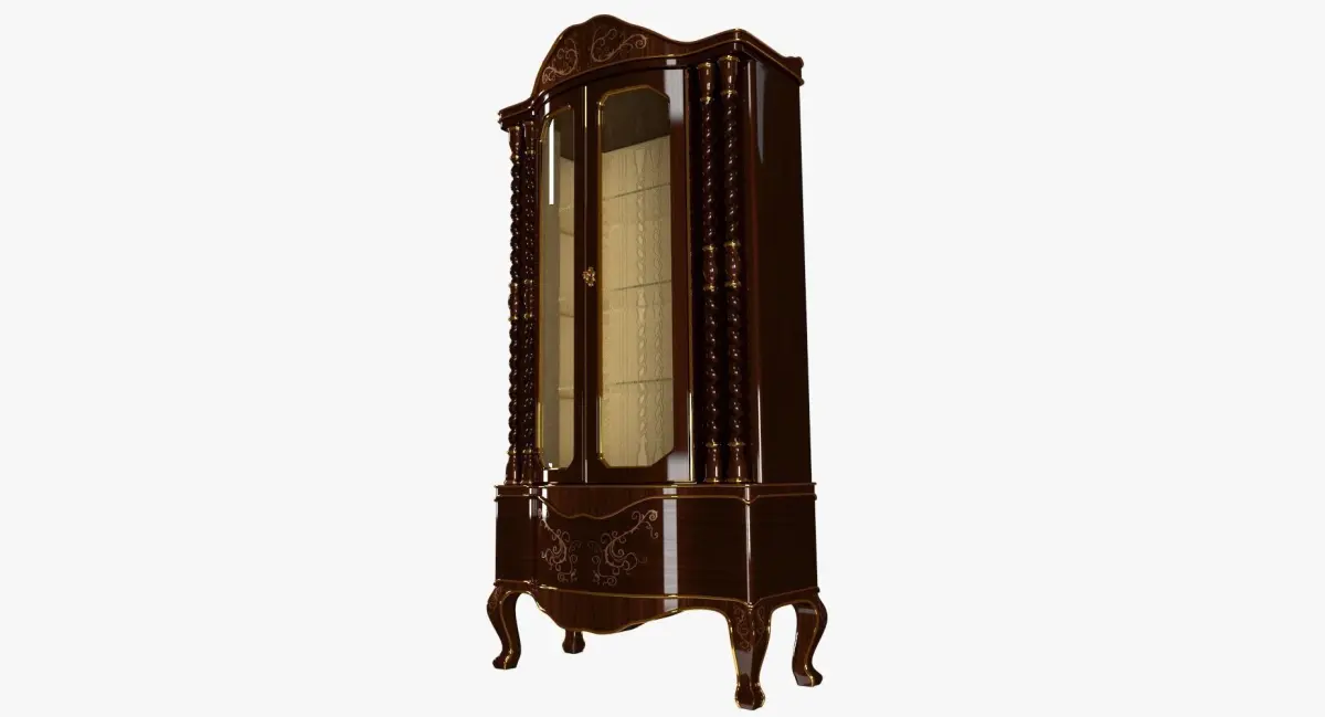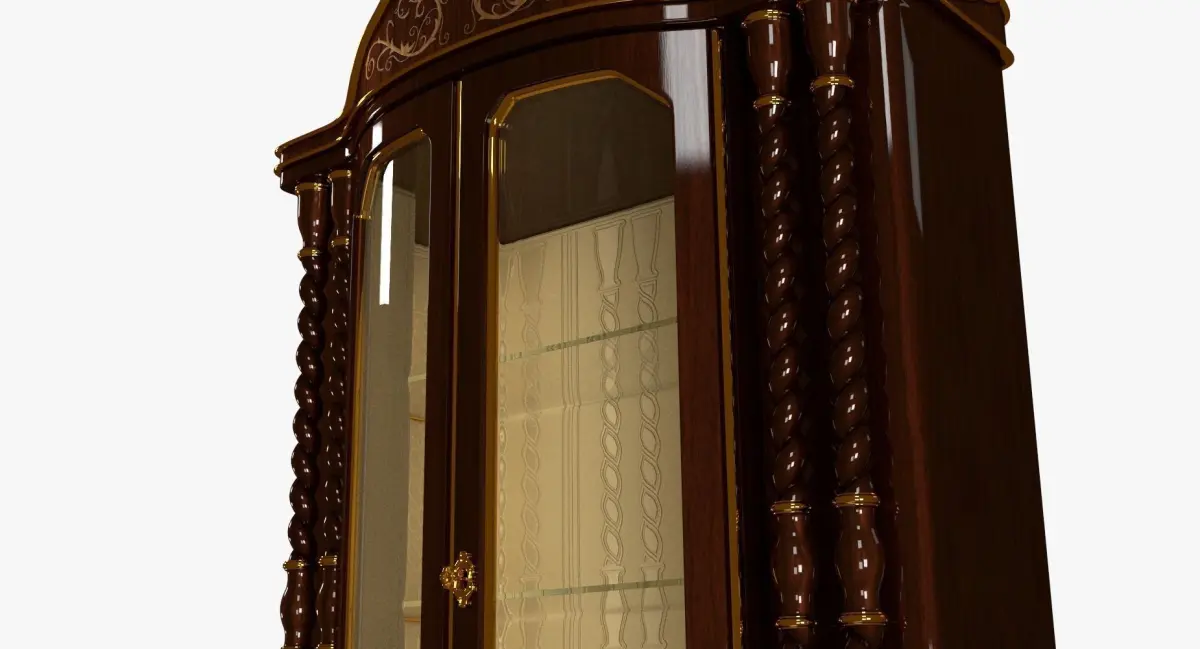 Glass cabinet 3D Model. Modeled in Blender 2.73, Preview images rendered with Cycles. Model in real world scale W:82.6 cm H:160 cm D:41.6 cm. Subdivided polygon mesh made of quads only. Poly count(without subdivision and mirror modifiers): Verts:12,143 Faces:12,067. Custom wood textures: 4000x4000. Suitable for close up renderings. Easy interchangeable wood texture(decorations mapped independently). Overlapping UVs are those of the two halves that are symmetrically mapped. Inside the single half the UVs are not overlapping. The model includes internal lighting of the cabinet. Render ready. Light and camera setup not included. FBX version includes instructions for modifiers to apply and use of included textures.