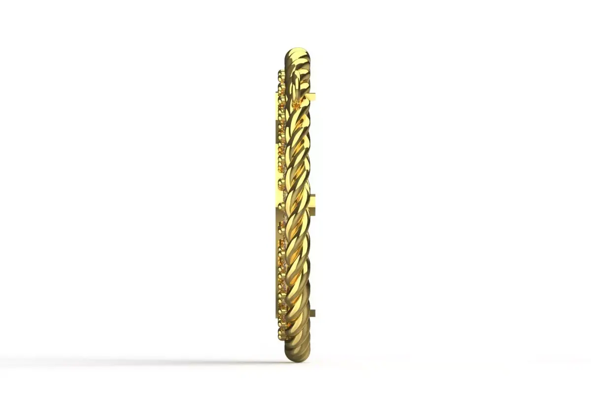 Technically, this pendant is made with complete precision from high-quality yellow gold. At its center, there is a large natural coral stone with Cabochon cut, whose perfectly polished surface and warm and rich color will capture the heart of every viewer. The outer frame of the pendant is designed in the shape of a woven rope and is decorated with a row of small and sparkling diamonds that multiplies its brilliance.