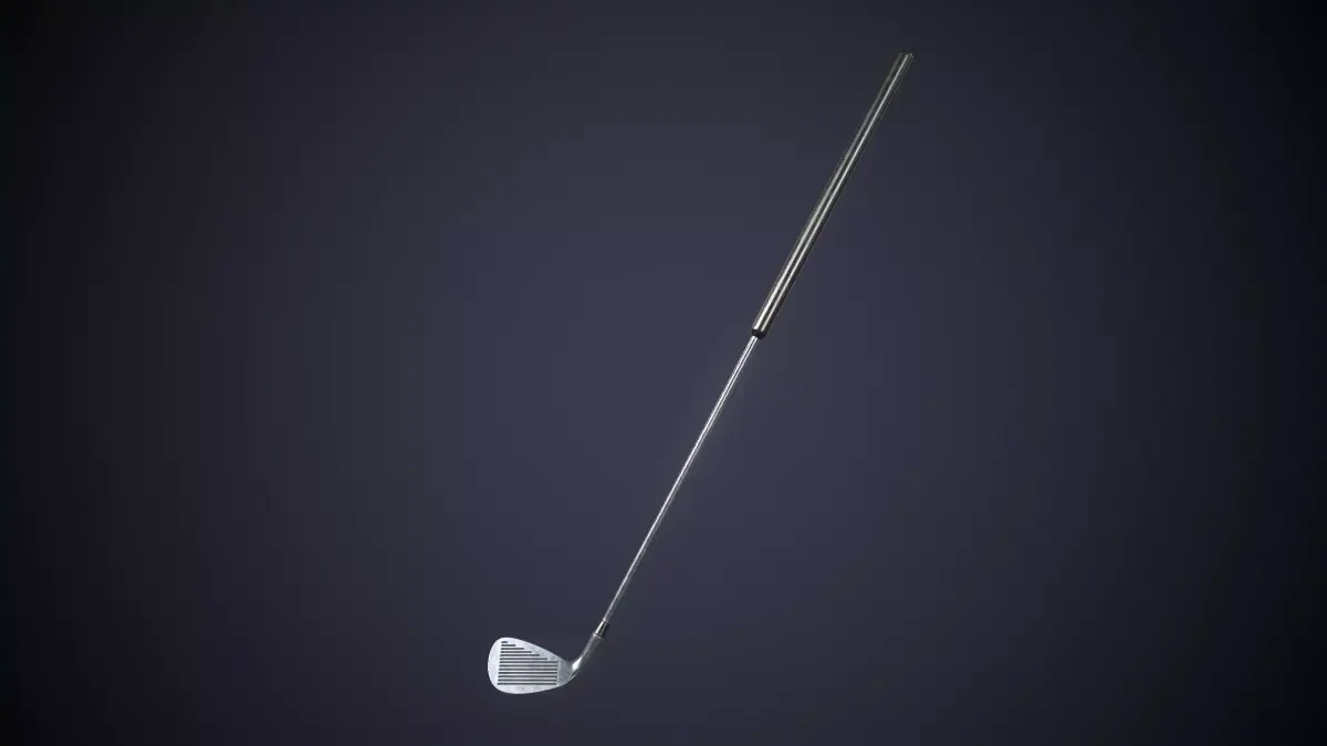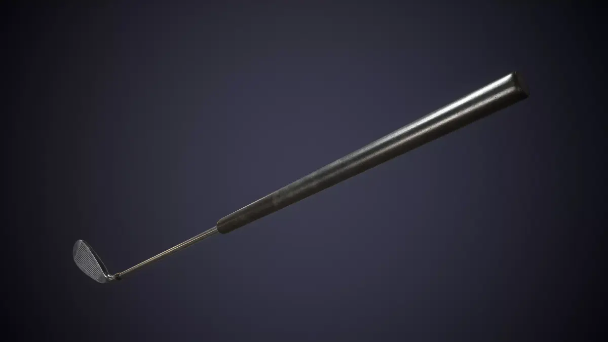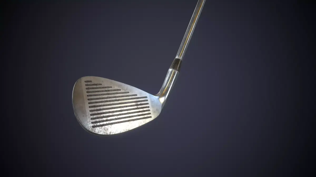 A weathered iron golf club featuring a worn metallic head and a textured rubber grip.