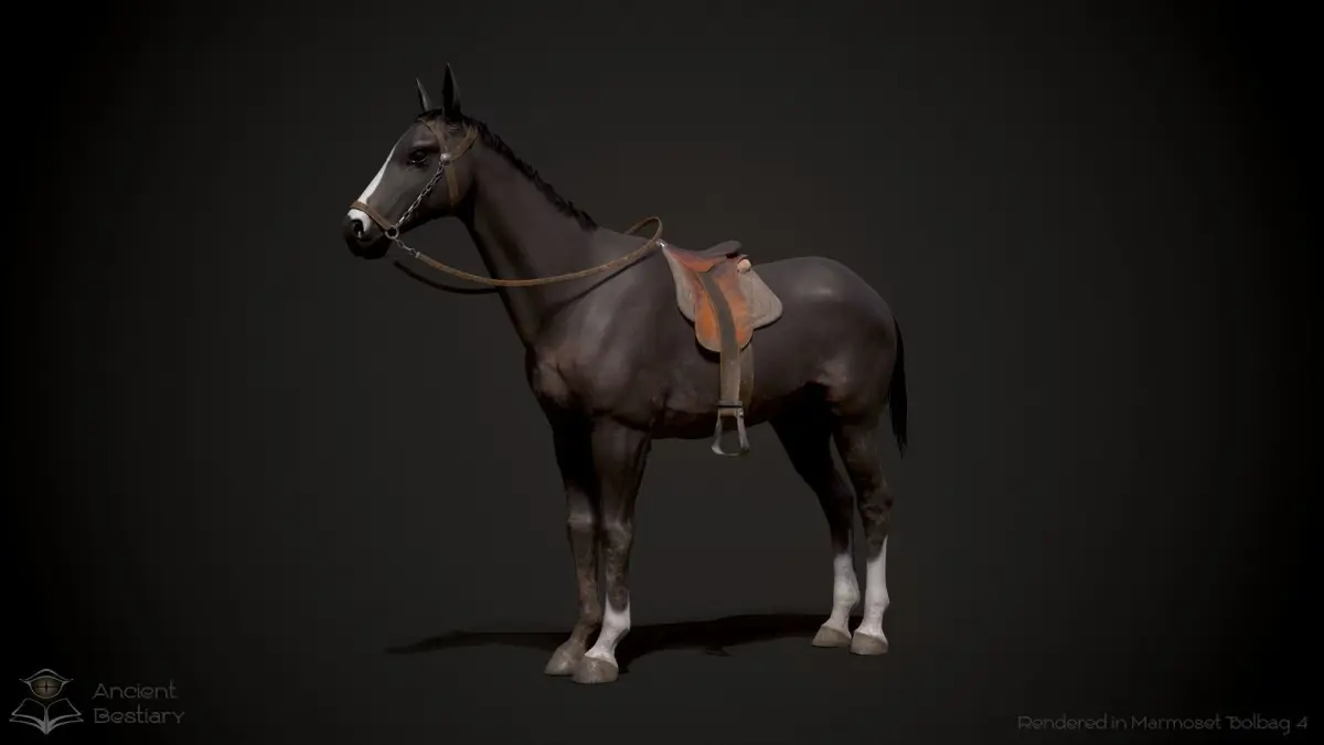 - horse's skeletal mesh (parts: body, jaw, tongue, eyes, hair tail, hair ears, hair neck, eyelashes, reins A, reins B, saddle A, saddle B, saddle A stirrup, saddle B stirrup)