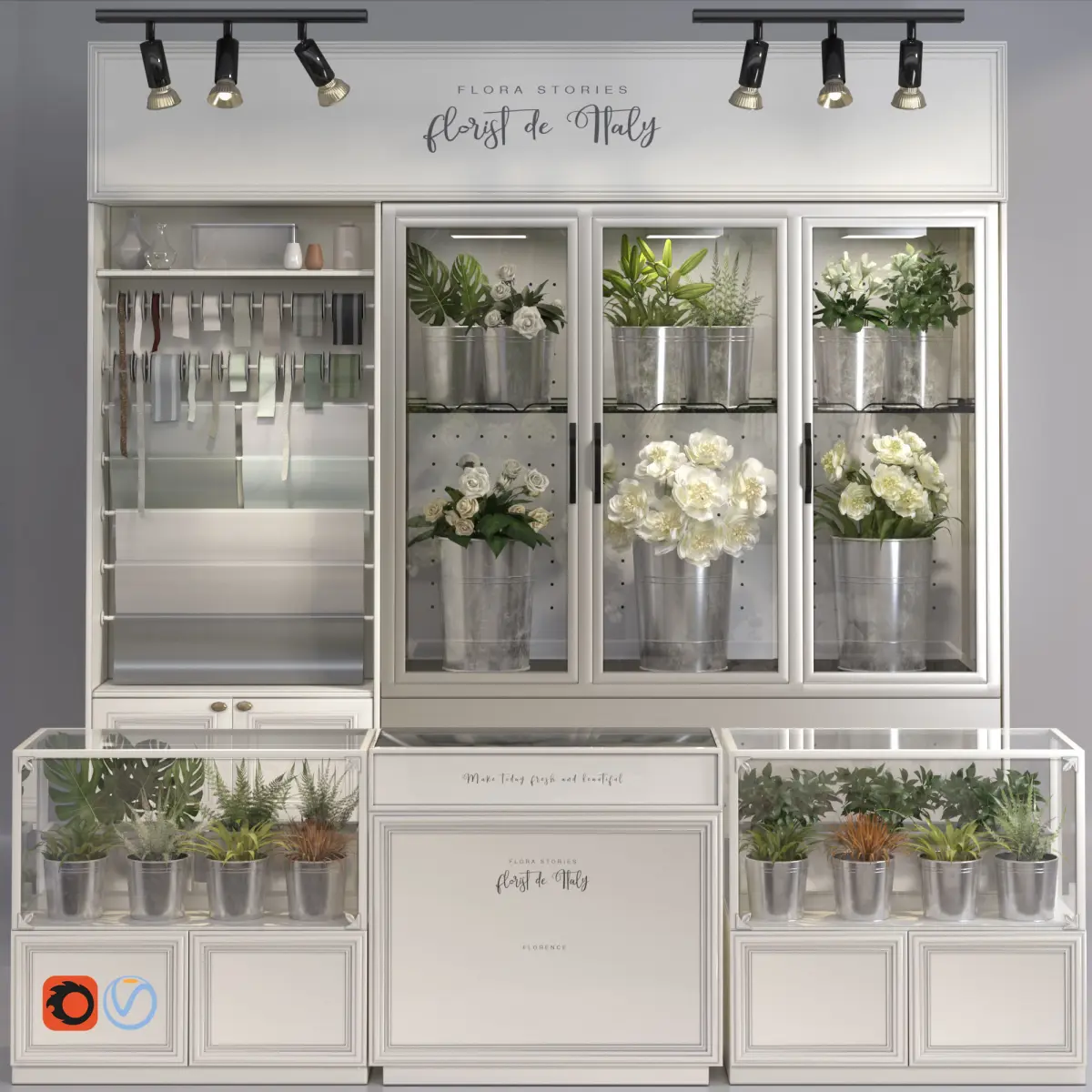 Floral Full Shop Furniture: counter, front display, geenery buckets (aloe vera, monstera, fern, grass, sedge...), refrigerated flower display, flower buckets (roses, lily, camelia, peony, bud...), decoration and ornament shelves (ribbon rolls, wrapping paper sheets, vases, bottles...), spotlight, cabinets...