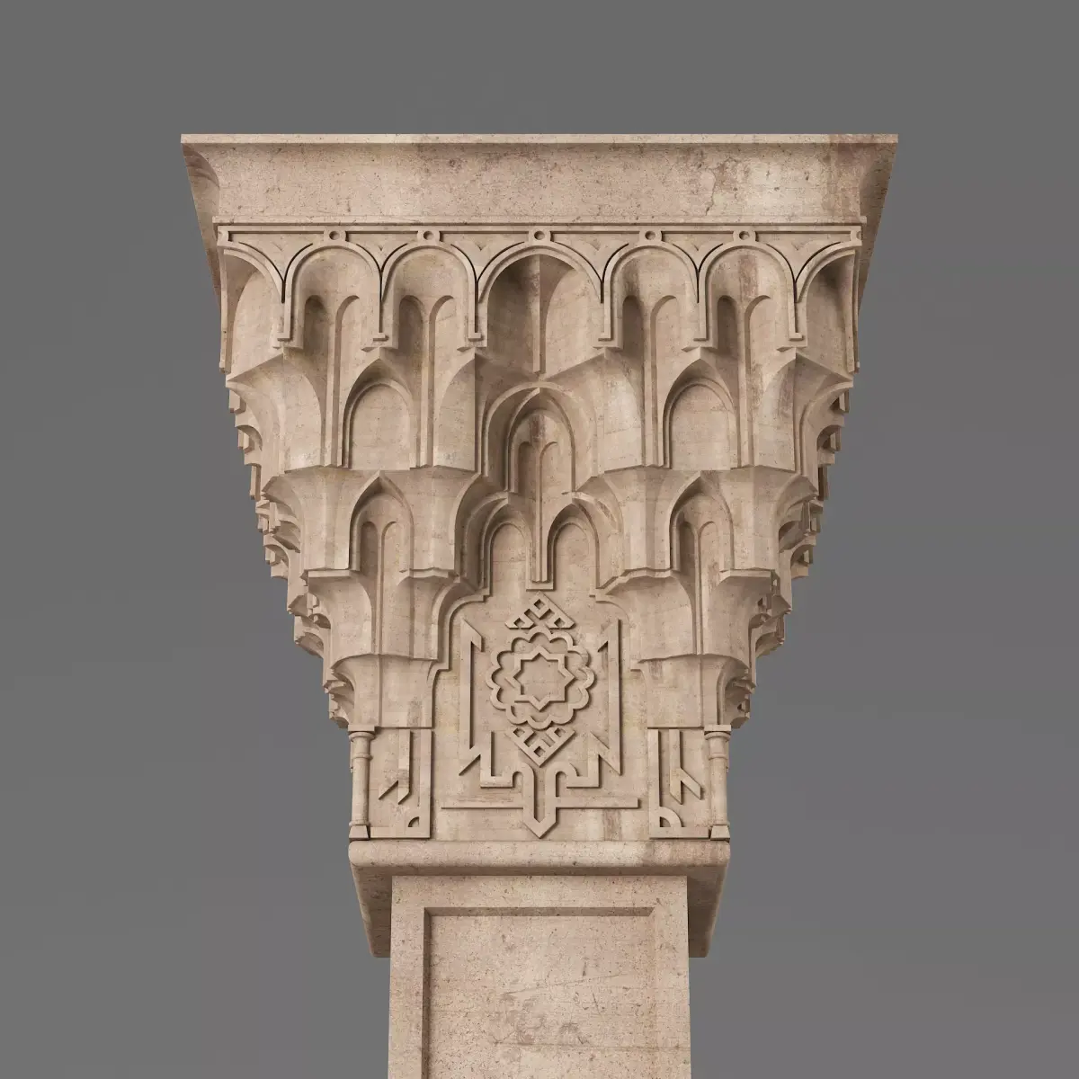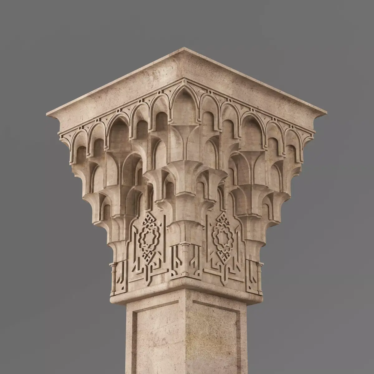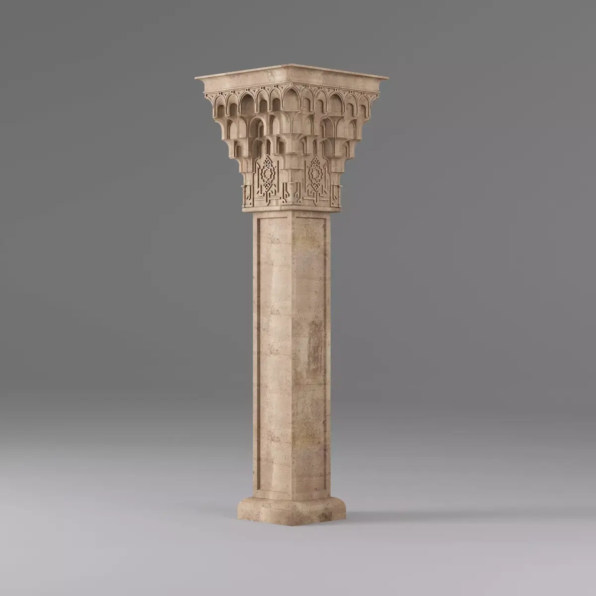 Classic Islamic Muqarnas Column 0043ds max modeling3ds max 2024Vray 6Polygons: 99 831Vertices: 106 432Unwrapped: Fully unwrapped , non-overlappingFormat : FBX, OBJ, STLHeight: 220 cmLength: 68 cmWidth: 68 cmTextures:All textures are seamlessConcrete_Diffuse - JPG 4096x4096Concrete_Bump - JPG 4096x4096Dirt_Texture - PNG 2200x2200
