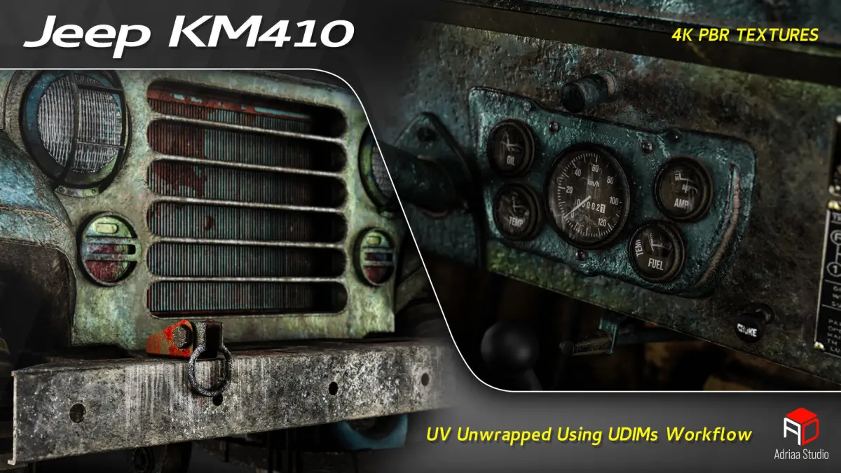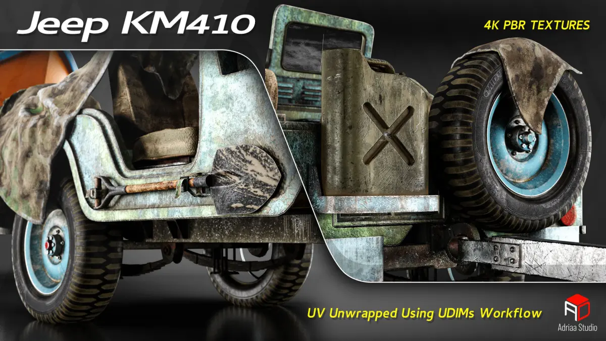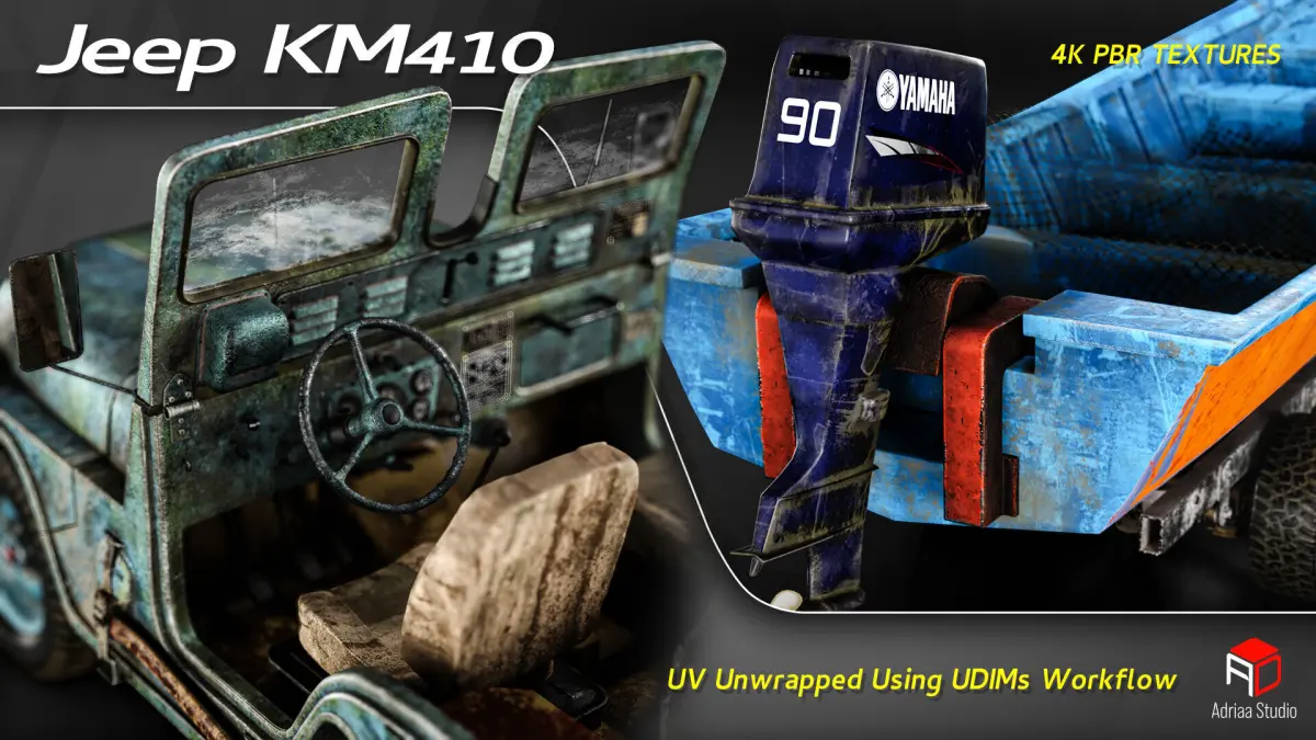 Discover a highly detailed 3D model inspired by the classic KM410 utility jeep, repurposed as a vintage boat hauler