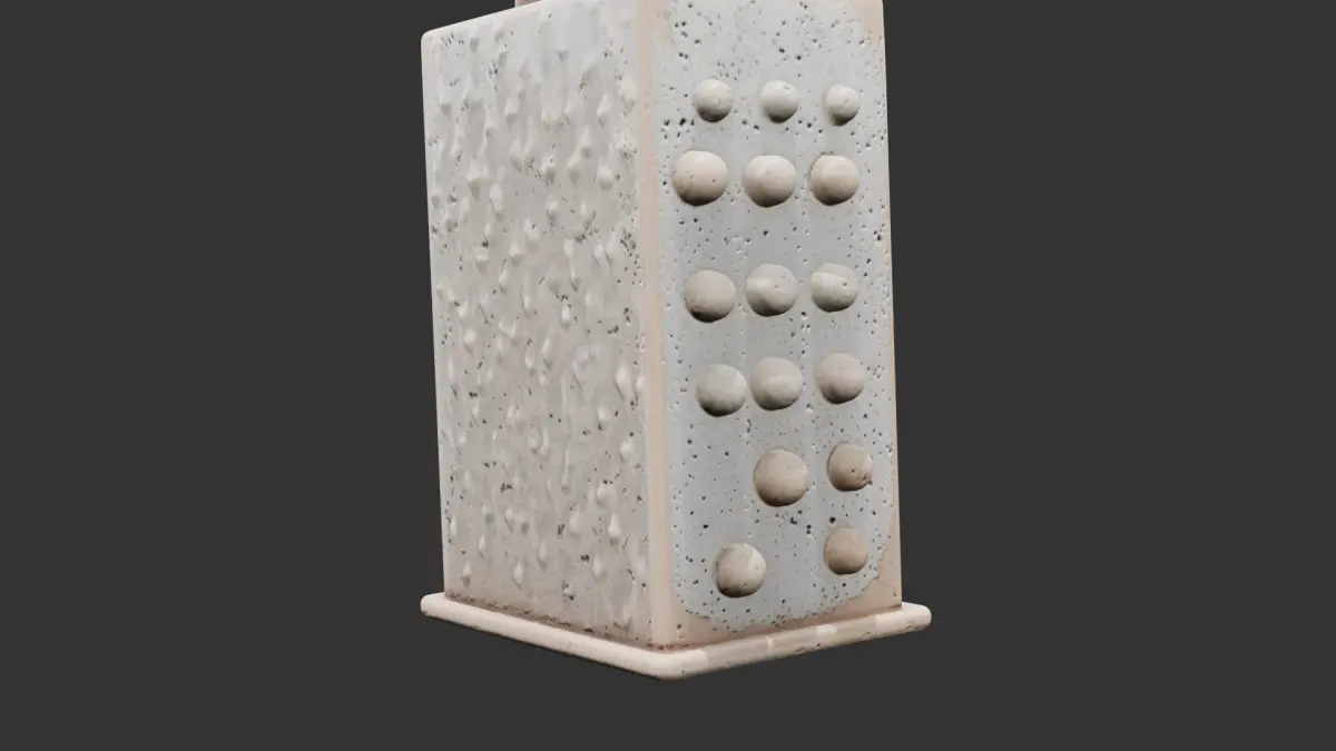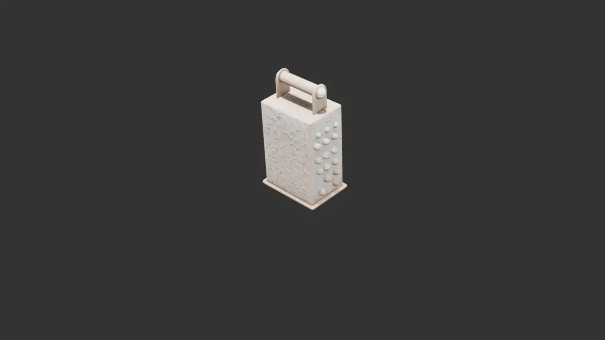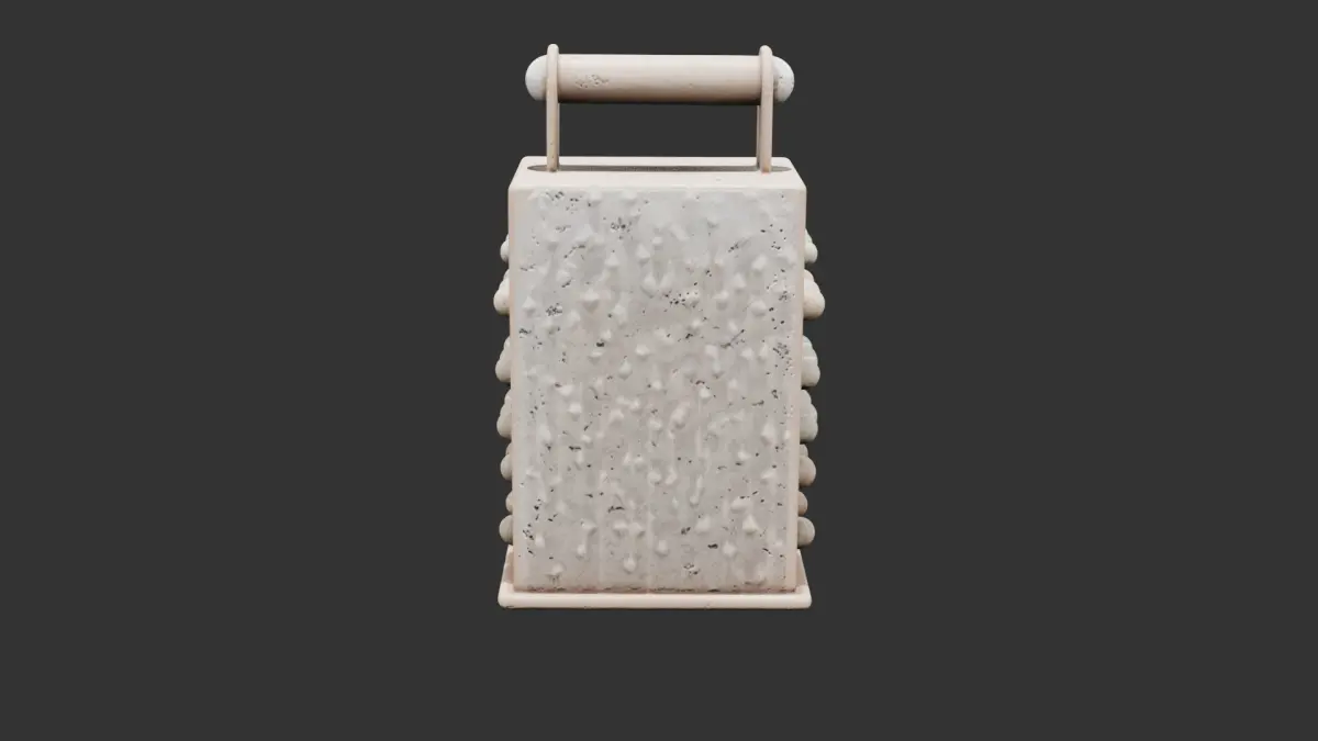 This 3D model features a tall, four-sided box grater with different blade types on each surface. It has a metal body with small scratches and slight dents, and a sturdy plastic handle. Designed for realism, this grater can be used in domestic, professional, or rustic kitchens. The blade types include fine, coarse, slice, and zest styles, all modeled with close attention to detail. The surface reflects light subtly, emphasizing the grater’s shape and material. This model can sit next to cheese props, on counters, or inside kitchen drawers for additional scene depth.