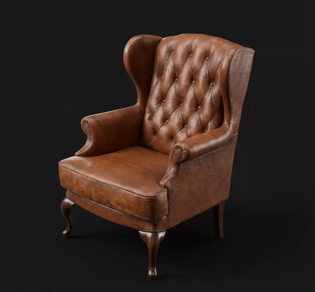 The chair features:Tufted leather backrest with realistic wrinklesSmooth leather seat cushionElegant wooden legs with classic curvesClean topology suitable for close-up renders