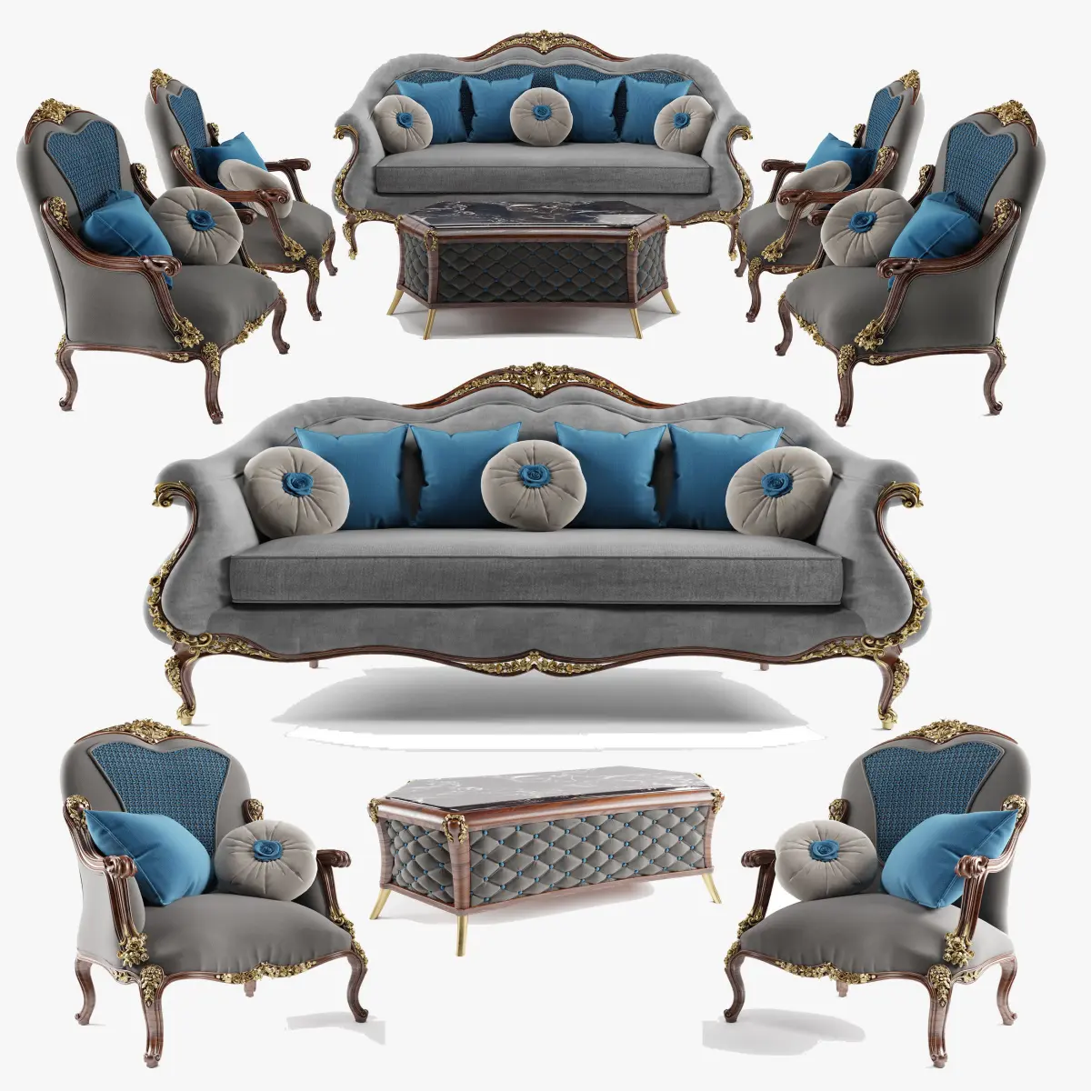 Classic living room design with natural dimensions from my complete design, decorated with cushions, fabrics, wood structure, and wooden decorations inlaid with goldThe wood carving has been designed with high quality for ease of execution, and there is no modification to the photosThe models in the Zero Zone consist of a sofa, two chairs and a table
