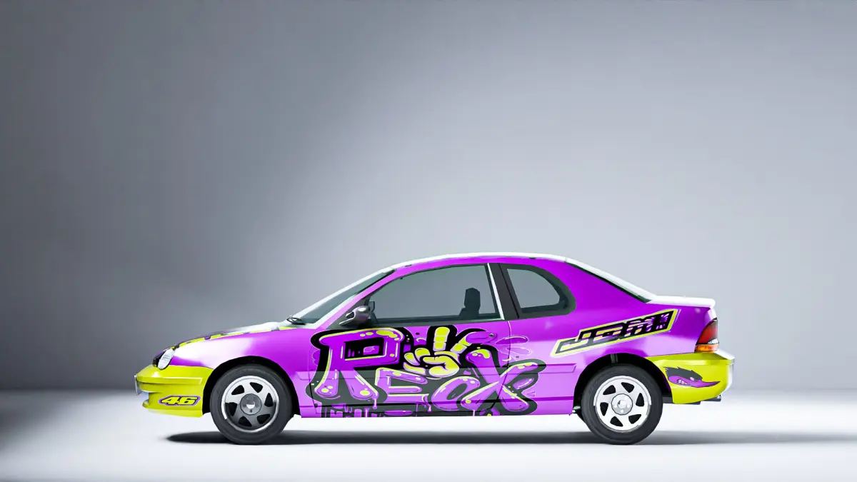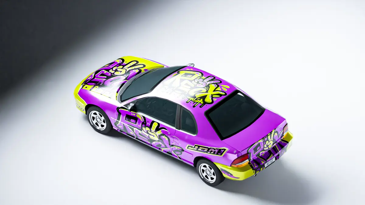 This is a game-ready low poly classic sedan featuring a vibrant, graffiti-style street livery.