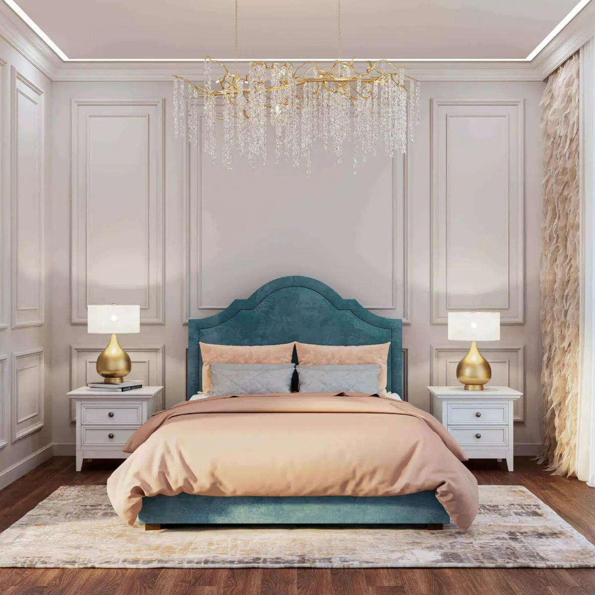 Included are neutral white-background views and a styled classic luxury bedroom scene (props like lamps/tables for display only, not included)
