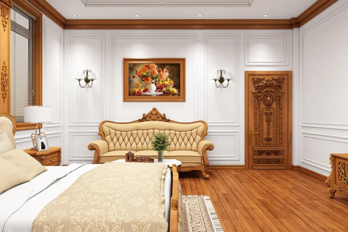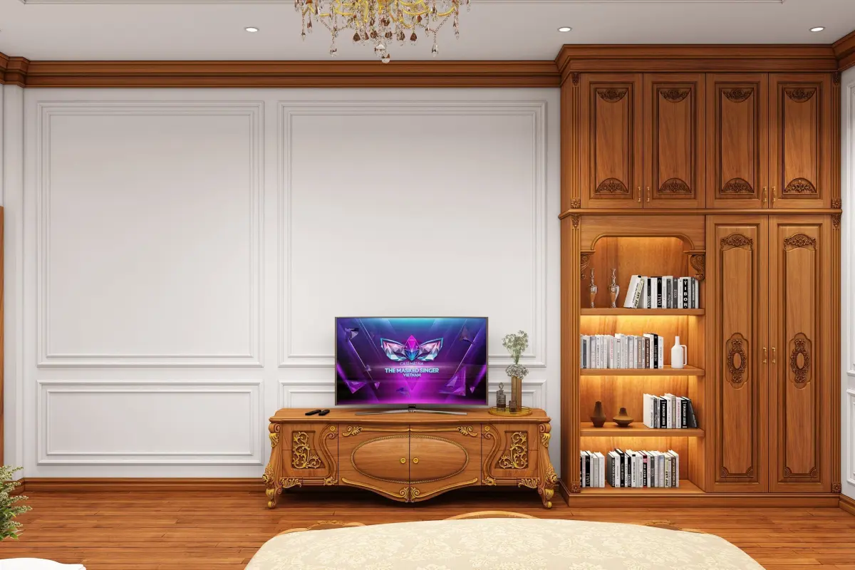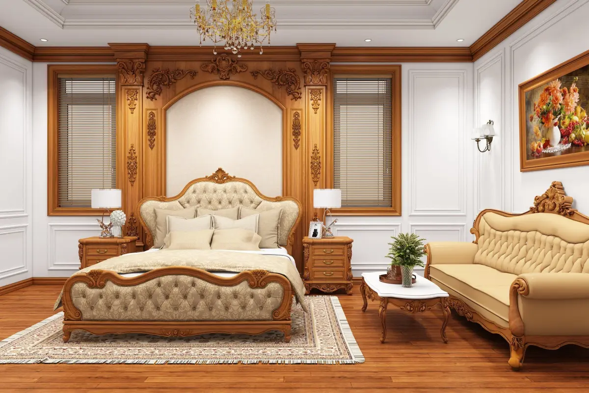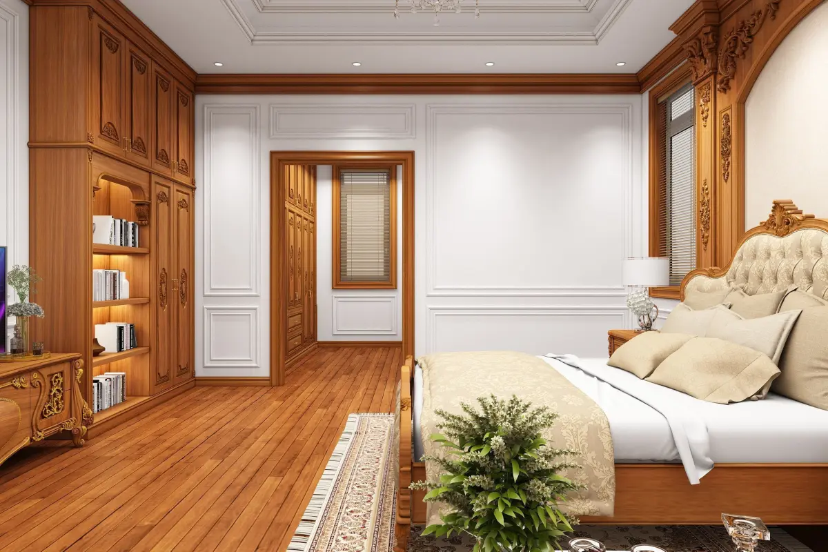 This is a high-quality 3D scene of a luxurious classical bedroom, crafted in realistic wood material with ornate carved details. The design features a traditional royal bed, full-height wardrobe, bookshelves, and wall paneling — all following real-world furniture proportions and construction logic.