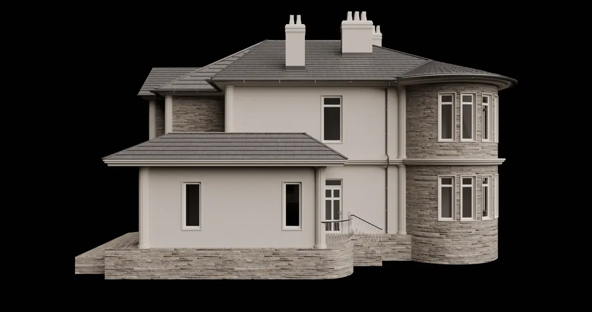 A medium to large house with a classic design. It has 2 storeys, 4 teracced areas, two on the upper floor and two on the ground floor, along with a double garage.