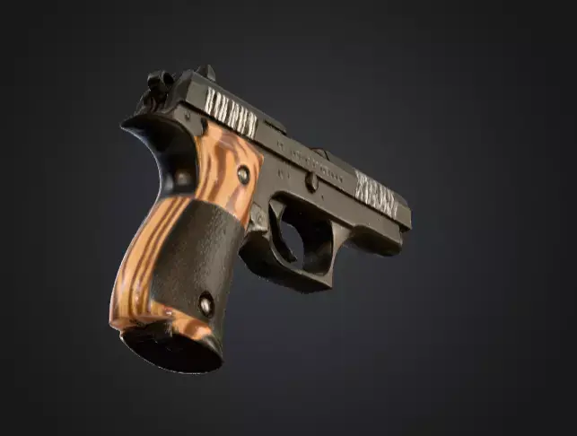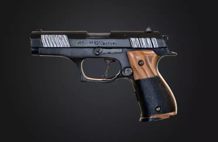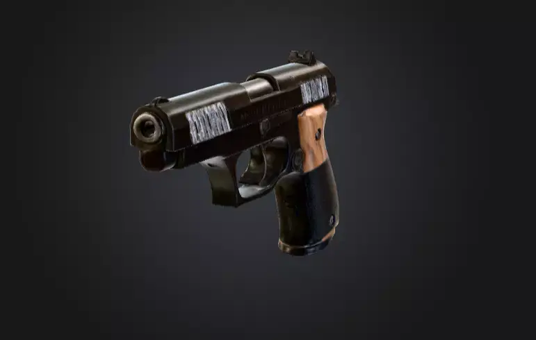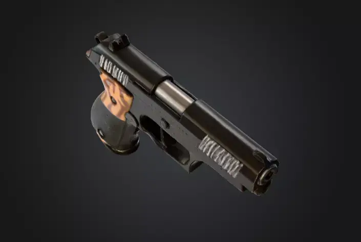 Realistic classic pistol design with detailed metal surfaces and subtle reflections.