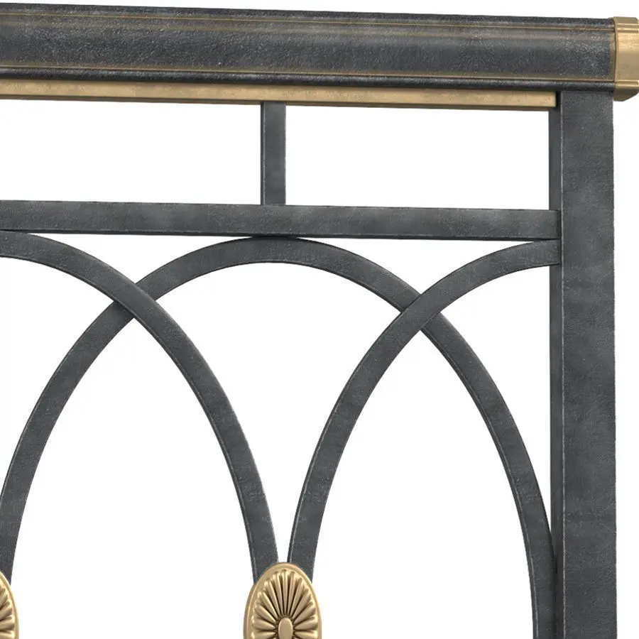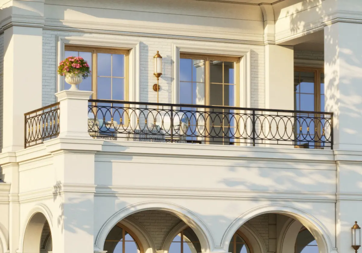 Tantiema Contemporary Forged Fence is an elegant modern classic oval forging with gold-plated cast inlays. Suitable for both facades with balconies and for interiors.