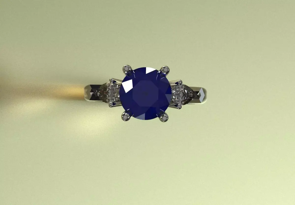 Ring JR00287: Classic/Modern Three-Stone Ring with Round Blue Center and Pear Side Diamonds, Symbol of Balance, Luxury and Deep ColorThe JR00287 ring is a Three-Stone Ring with a classic design but with a modern and colorful twist. The design is characterized by a Large Round Blue Gemstone in the center, and two Pear-Cut Diamonds on either side. This ring focuses on sparkle, bold color combination, and stone symmetry, creating an incredibly luxurious, romantic, and timeless look.