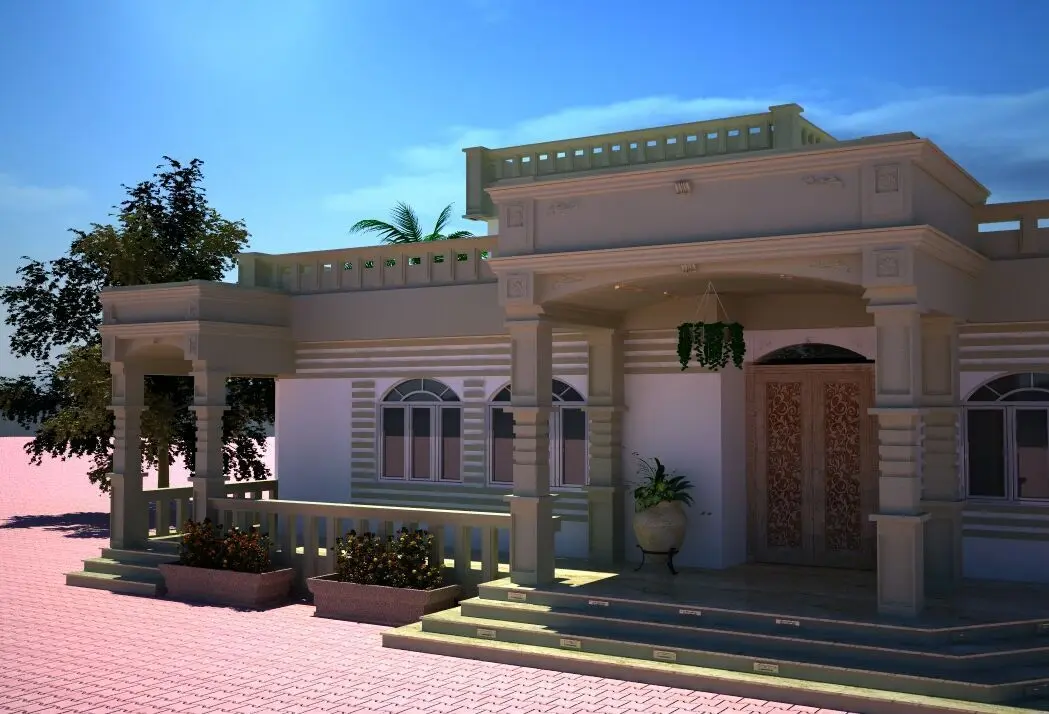 A beautifully detailed one-story villa design with classic columns and arched windows. This residential model includes landscaped surroundings, a wide front yard, and soft pastel tones ideal for warm climates. The package includes DWG format drawings and high-quality renders, perfect for architects and developers.