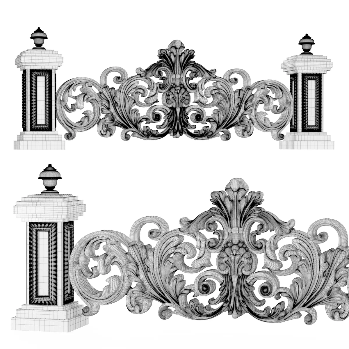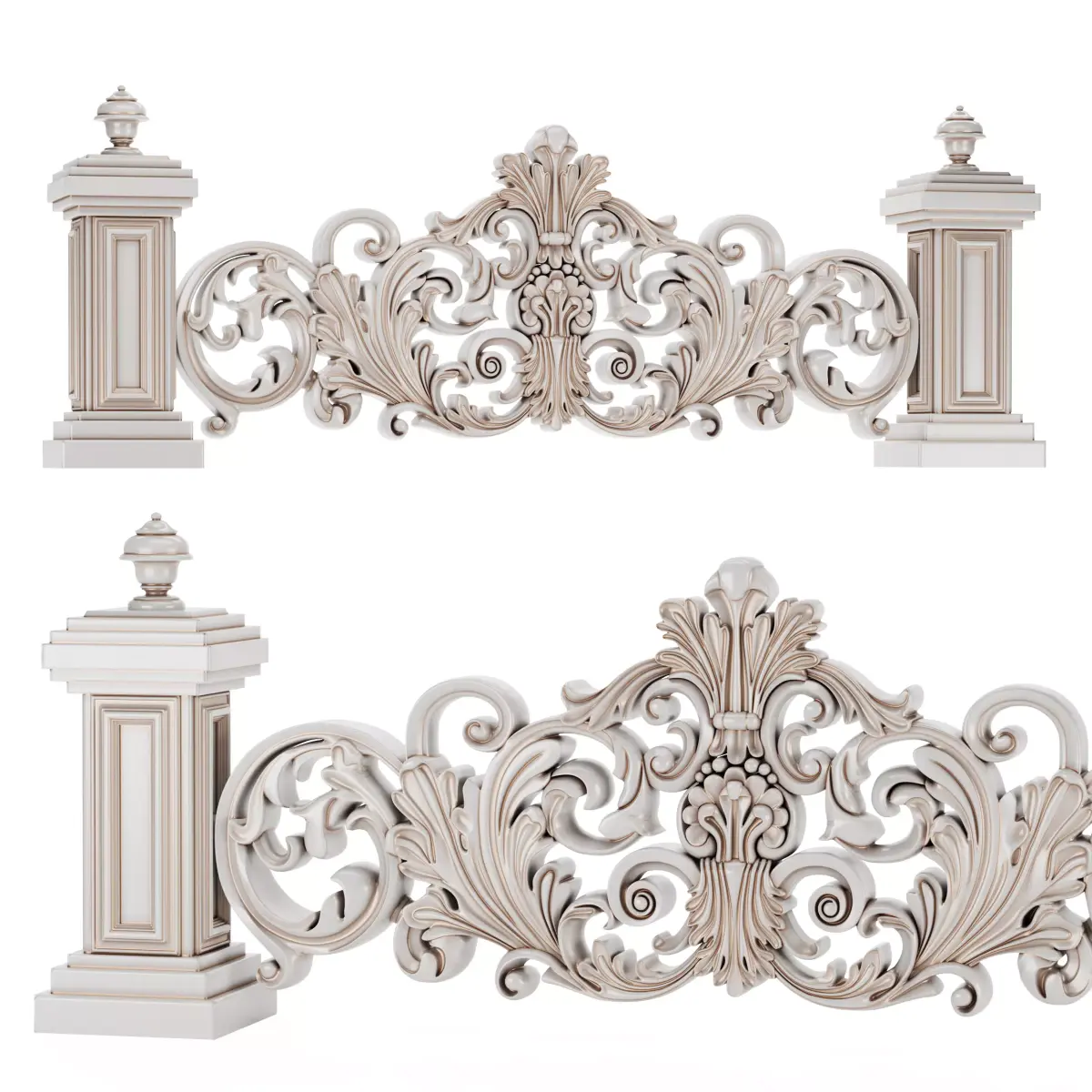 High-quality classic ornamental balustrade with decorative columns, designed in neoclassical style. The model features detailed acanthus and scroll ornaments, suitable for exterior and interior architectural projects such as balconies, stair railings, terraces, facades, and luxury interiors.