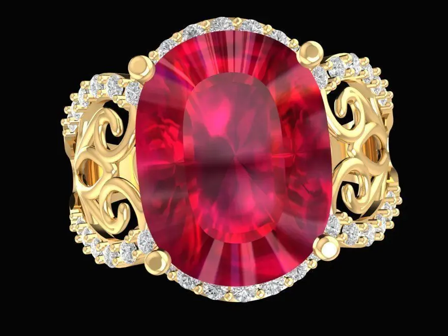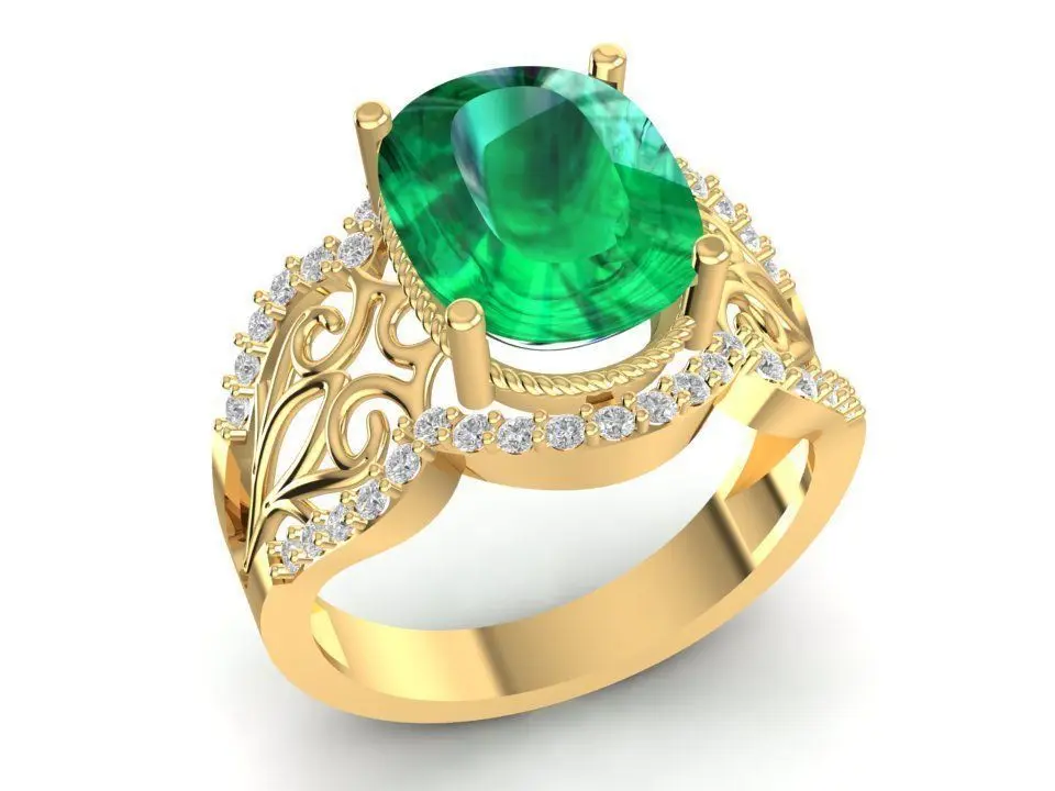 This 3D jewelry model showcases an elegant women's ring featuring a large oval-cut gemstone as the centerpiece, surrounded by detailed filigree patterns and sparkling side diamonds. The design blends vintage artistry with modern refinement, creating a luxurious piece perfect for fine jewelry collections.