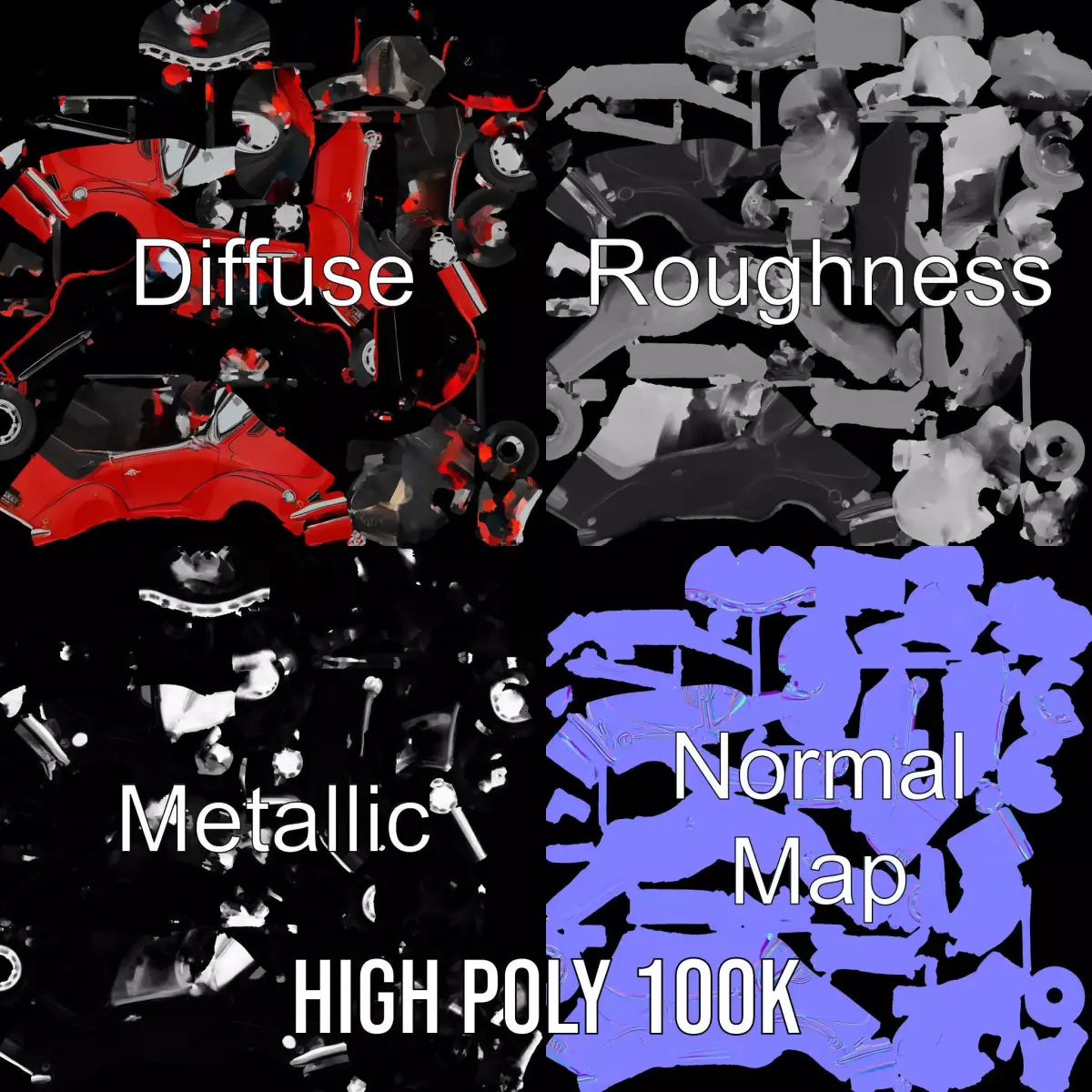 This detailed Classic Red Cabriolet model pack features a retro design with a sleek, shiny finish. Ideal for vintage car enthusiasts, it is perfect for use in both urban and countryside settings in games and visualizations. Each model has 3 levels of detail: low-poly (1000 triangles for mobile), middle-poly (10,000 triangles for environment), and high-poly (100,000 triangles), which allows for the use of this model in production rendering (such as 3ds Max, Maya, Cinema4D, Blender, Vray/Corona/Cycles and all others), game engines (Unity and Unreal compatible), and interactive presentations, providing a choice of detail based on the LOD System principle. The model's textures are PBR, Diffuse, Normal Map, and reflection/roughness/metallic, which are suitable for any modern rendering engine. All models are accurately unwrapped with no overlapping UV. All textures are 4096*4096 in size. Please like and leave a comment for the model if you enjoyed it.