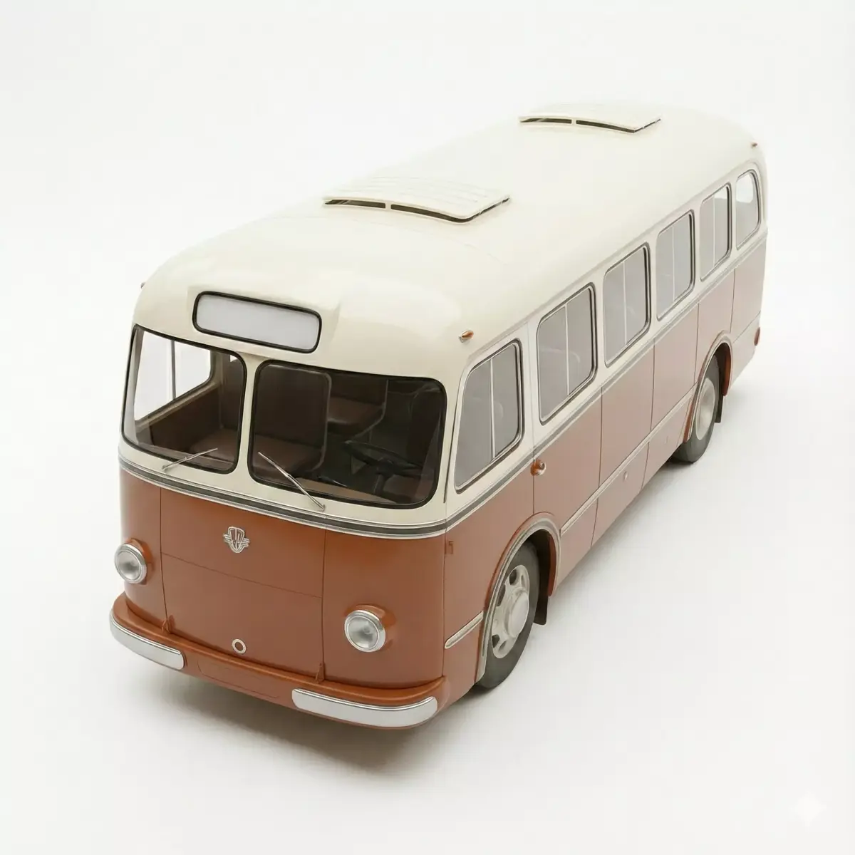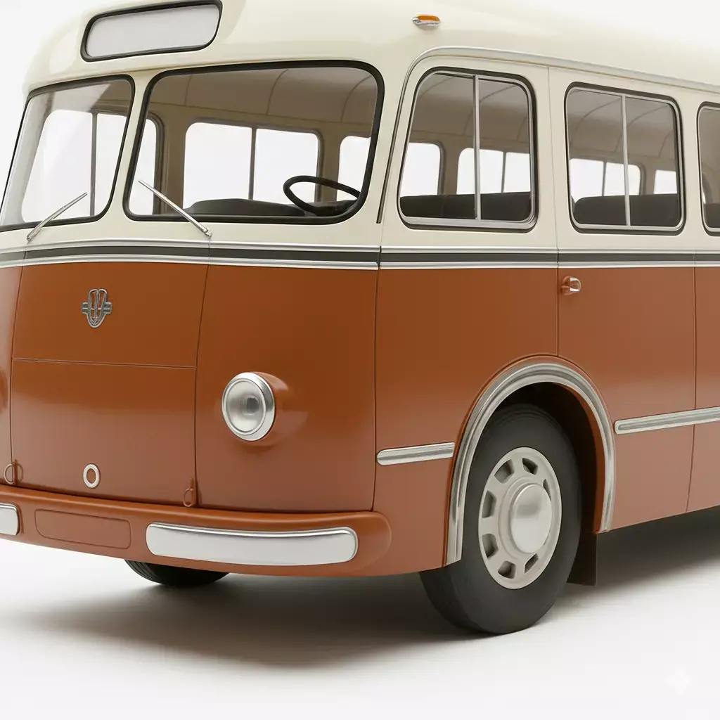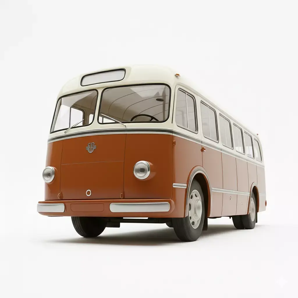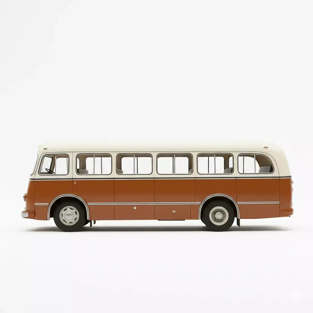 This is a high-quality 3D model of a classic European-style bus with a distinctive retro design. The model features a two-tone paint scheme of deep maroon/brown on the lower body and cream/white on the roof and window lining, capturing the aesthetic of public transportation vehicles from the mid-20th century. Notable design elements include large, round headlamps, a prominent chrome bumper, split windshields, and multiple side windows. The model is rendered in a clean, studio-like environment with soft, directional lighting, highlighting its smooth surfaces and realistic proportions. This asset is ideal for projects requiring a touch of nostalgia, such as historical visualizations, game environments, or digital collectibles.