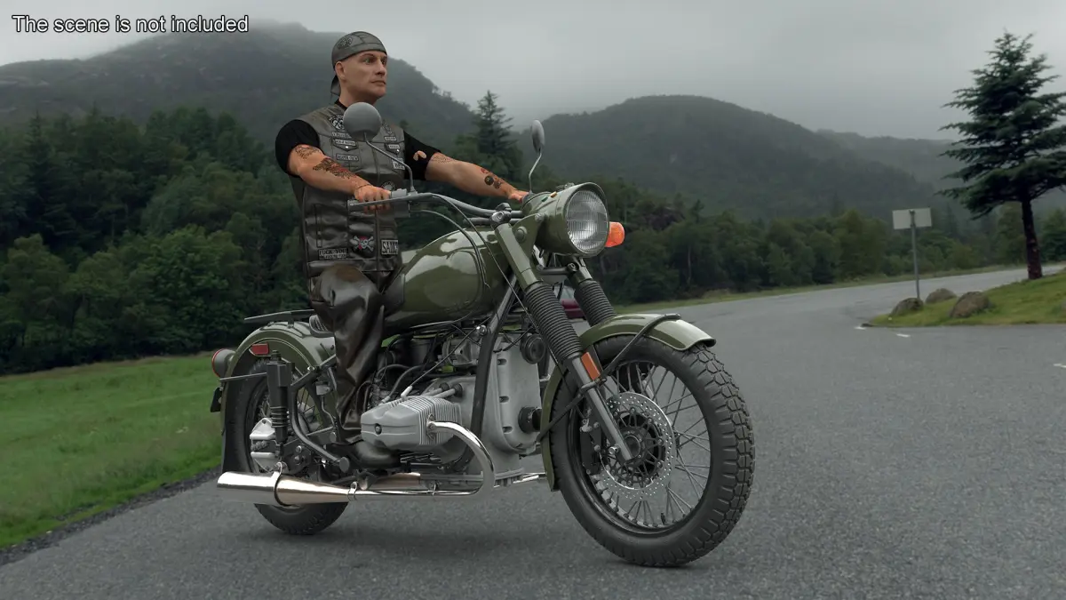 This model features a timeless design, with an olive-green finish and detailing that highlights its retro aesthetic. The motorcycle has a robust build with signature elements like a prominent front headlight, spoked wheels, and a rugged frame. The rider is decked out in traditional biker gear, including a vest with patches and a bandana, reflecting the iconic look associated with motorcycle enthusiasts.