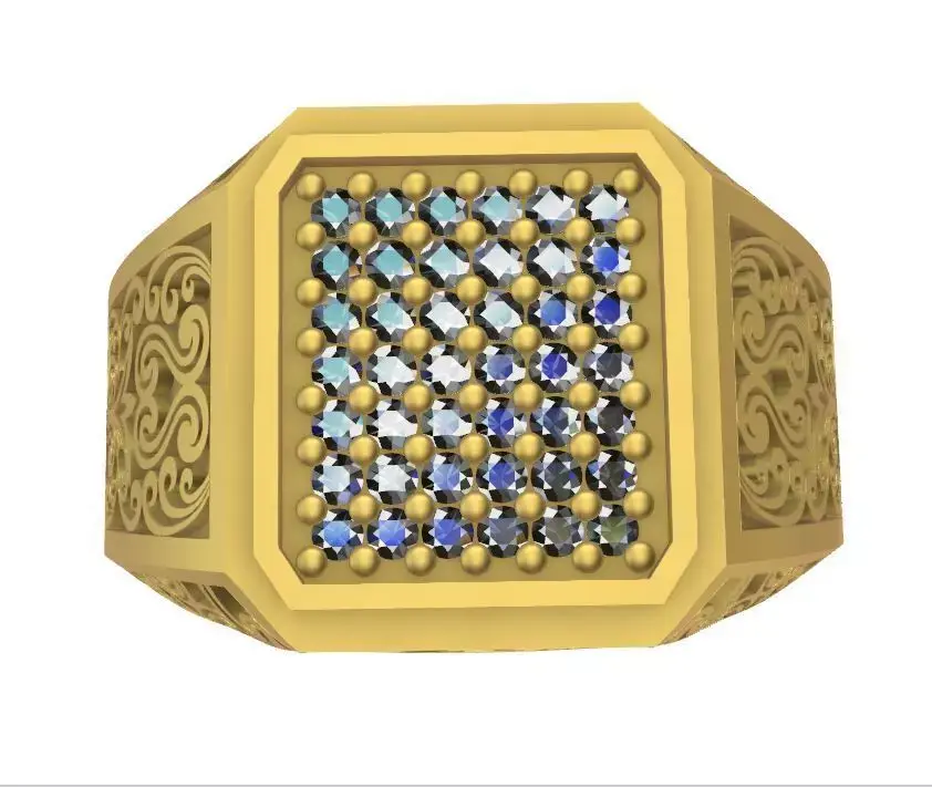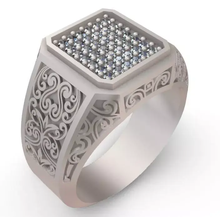 Men's ring with a classic design; arabesque and graceful curved motifs are engraved on the shank. The files are layered (editable), so the ring’s details can be modified and it is not a single, one-piece file. It can be either cast as wax (lost-wax) or cast in metal. Support files have been provided and it is ready for a 3D printer. The top segment of the ring is removable, allowing a black stone to be substituted. Forty-two stones of 1.3 mm diameter are set into it, and the prongs are designed so the stone can be mounted on the wax before casting.