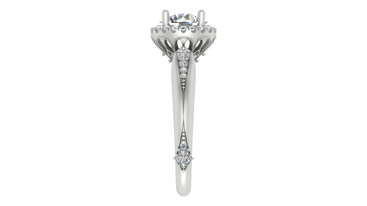 This halo engagement ring design is ideal for those who appreciate a balance between traditional elegance and modern refinement. The brilliant-cut diamond, vintage-inspired filigree work, and pavé-set stones make it a luxurious and timeless choice for engagements and special occasions.