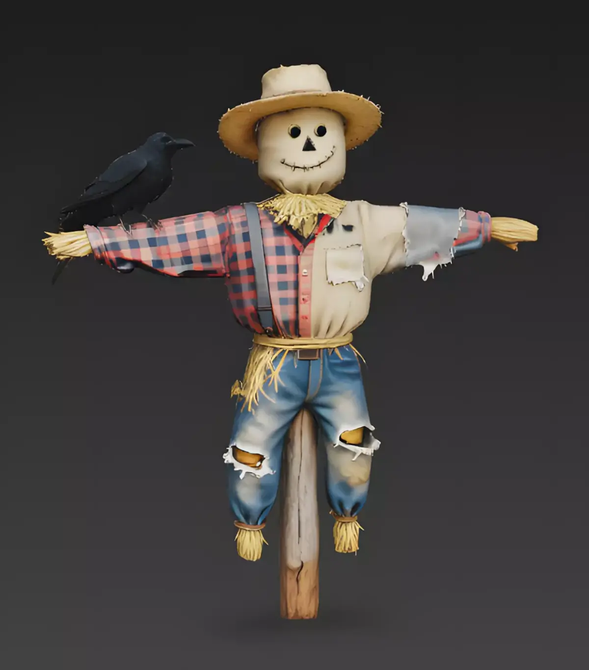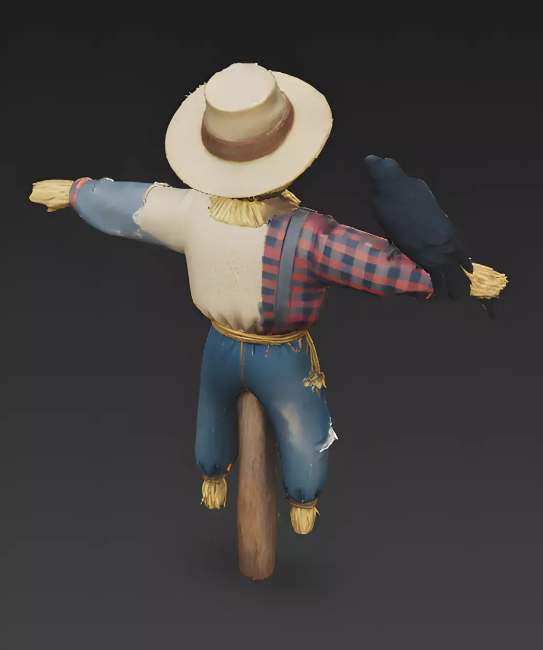 Perched Crow Companion A highly detailed black crow sits calmly on the scarecrow's right arm. This ironic detail—a bird resting on the thing meant to scare it away—adds life, storytelling, and a focal point to the asset.